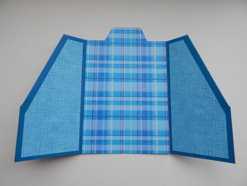 Сгибаем две части к центру, разглаживаем и приклеиваем те части, которые отгибаются. Галстук фиксируем на рубашке. Клеем ее на лицевую страницу открытки.
