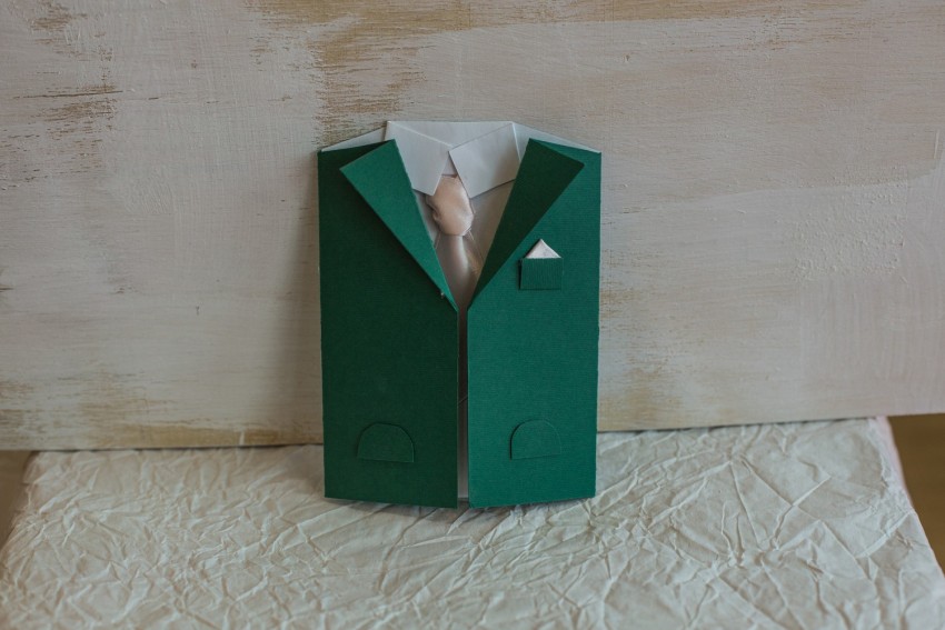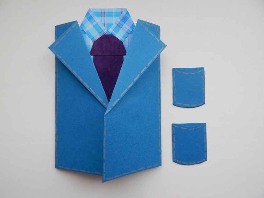 Если добавить наружный слой другого контрастного цвета, получится пиджак. Методом аппликации можно приклеить жилетку или галстук. Освоив один шаблон и способ складывания, вы легко изготовите много разных моделей, меняя цвет и фактуру бумаги, а также декор. Вы без усилий сделаете собственную коллекцию образцов, например, таких, какие изображены на первом фото в публикации.