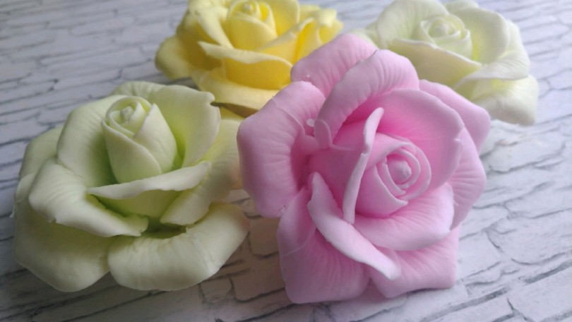 - С помощью круглых формочек, больших и меньших, вырезать лепестки. Складывая по кругу лепестки, выложить розу. Сделав несколько мыльных роз и листки, выложив в лотке, можно приготовить интересную композицию к 8 Марта.