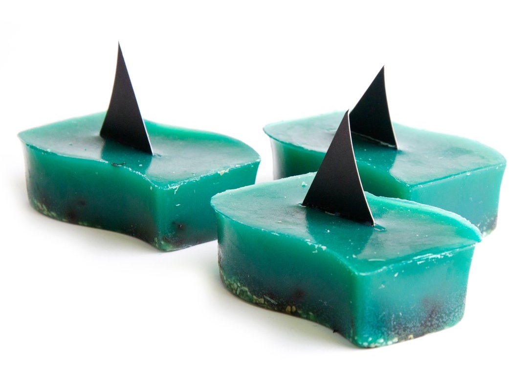 Очевидно, вдохновившись этим примером, другие мыловары пошли дальше – и засунули в брусок мыла целую акулу. Вернее пластиковую фигурку акулы. Мыло в таком необычном оформлении представлено в магазине американской рукодельницы OoohLaLaTheSoapBar. Синяя акула внутри прозрачного бруска смотрится очень эффектно.