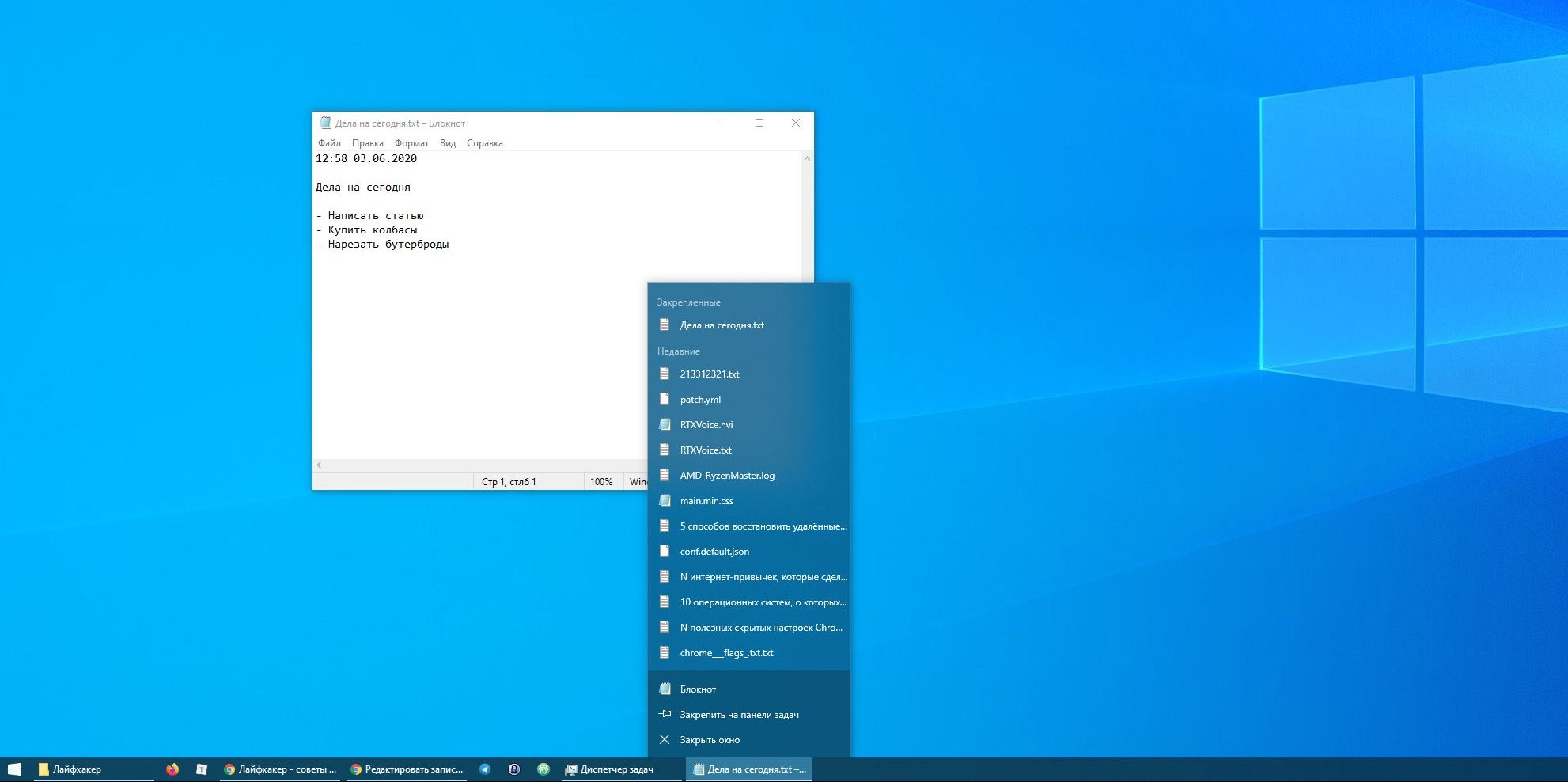 Создавая заметки в «Блокноте», можно сортировать их как угодно, потому что это обычные файлы. Раскладывайте их по папкам, присваивайте им названия, закрепляйте папки с ними в боковом меню «Проводника», на панели задач, в меню «Пуск» — в общем, развлекайтесь как угодно.