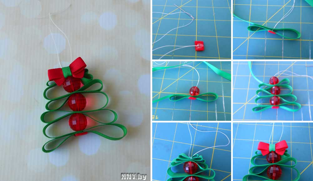 Сделать елочку можно из ленты, сочетая с крупными бусинами. Такую поделку можно повесить на настоящую елку или подарить кому-нибудь в качестве сувенира. Пошаговую фото инструкцию смотрите ниже.