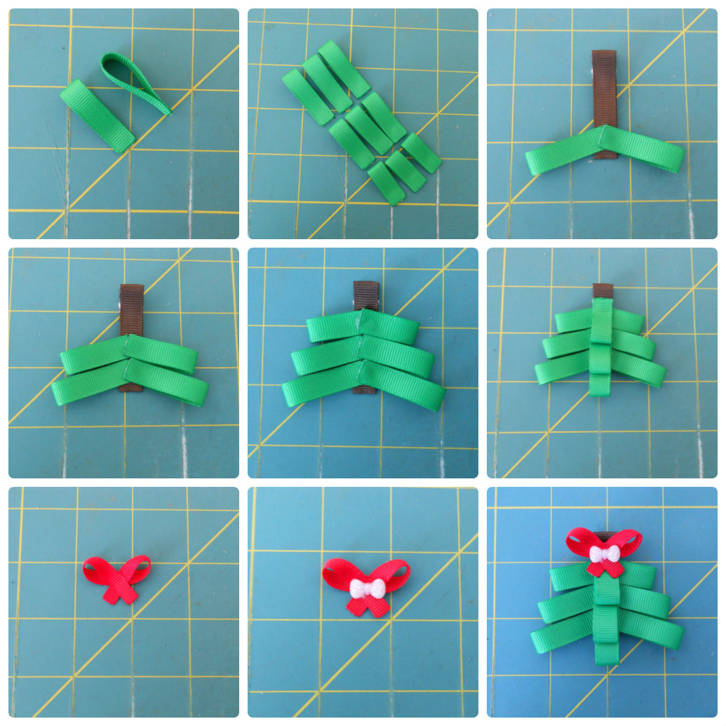 Вот еще один оригинальный способ декорировать заколку для волос лентами. Получиться миниатюрная елочка, которая прекрасно дополнит новогодний образ. Как сделать заколку смотрите на картинке ниже.