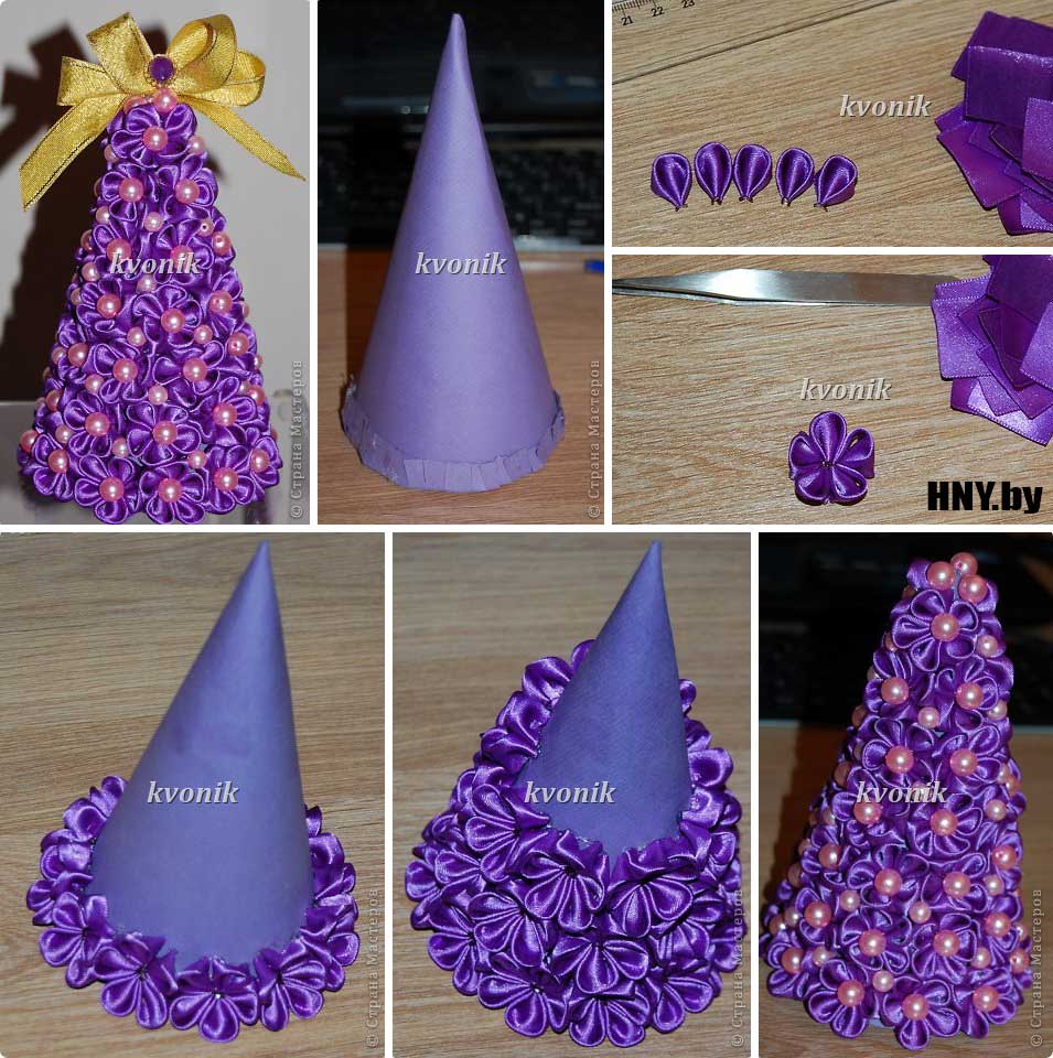 Можно сделать конус из картона и оклеить его ленточками. К конусу из пенопласта их удобно крепить при помощи швейных булавок.