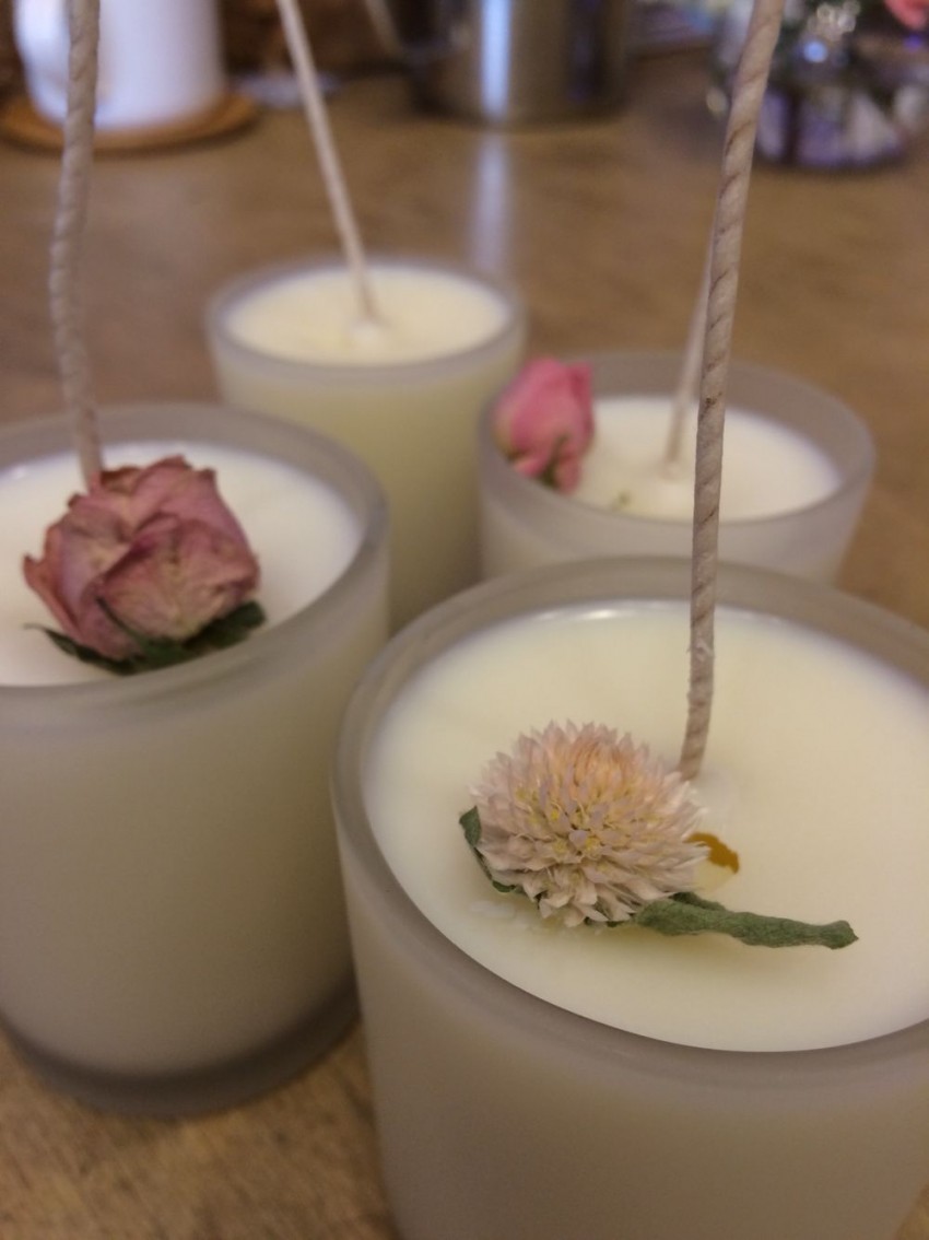 Возьмите другую свечу, порежьте ее на части, удалите фитиль. Растопите парафин, перелейте в другую емкость и окуните в него свечу с цветами.
