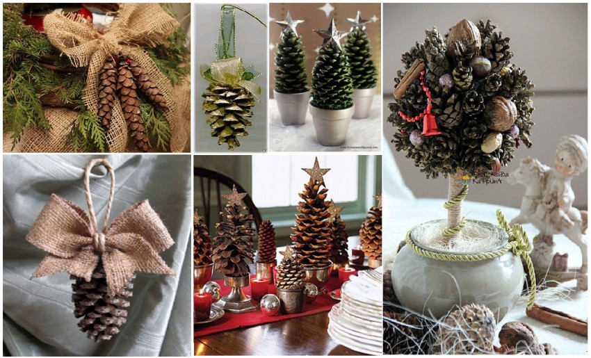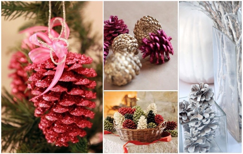 Еще один распространенный вариант – это новогодние украшения из шишек. Их можно развесить на елочке в натуральном виде, а можно украсить с помощью блесток, искусственного снега или блестящей краски.