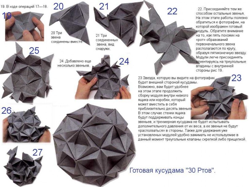 По принципу шара из модулей делается кусудама — это бумажная модель шарообразной формы, которая, как правило, делается сшиванием вместе концов множества одинаковых элементов. Это пришло с древней Японии.