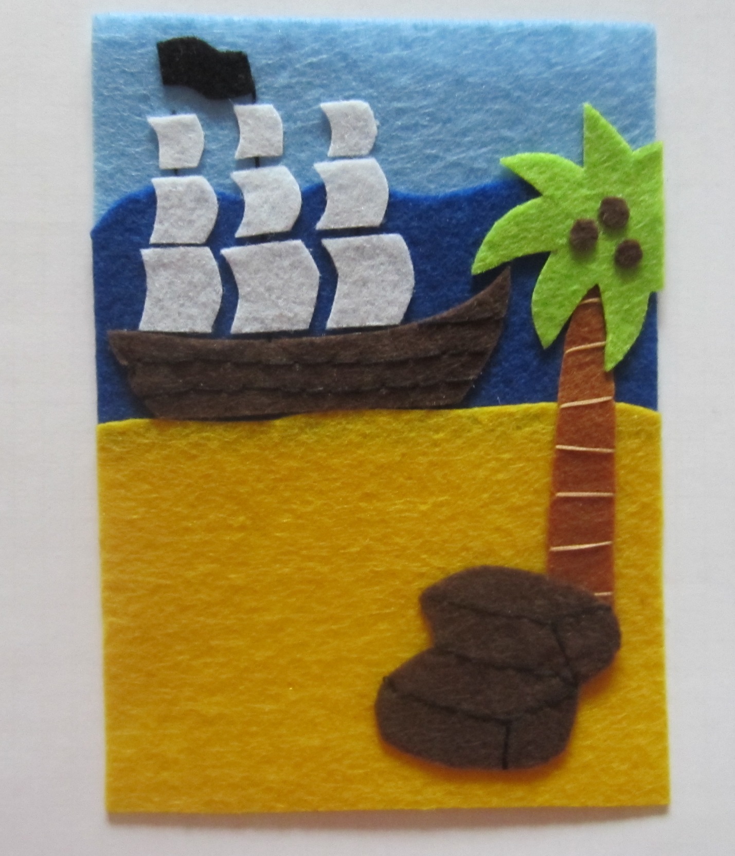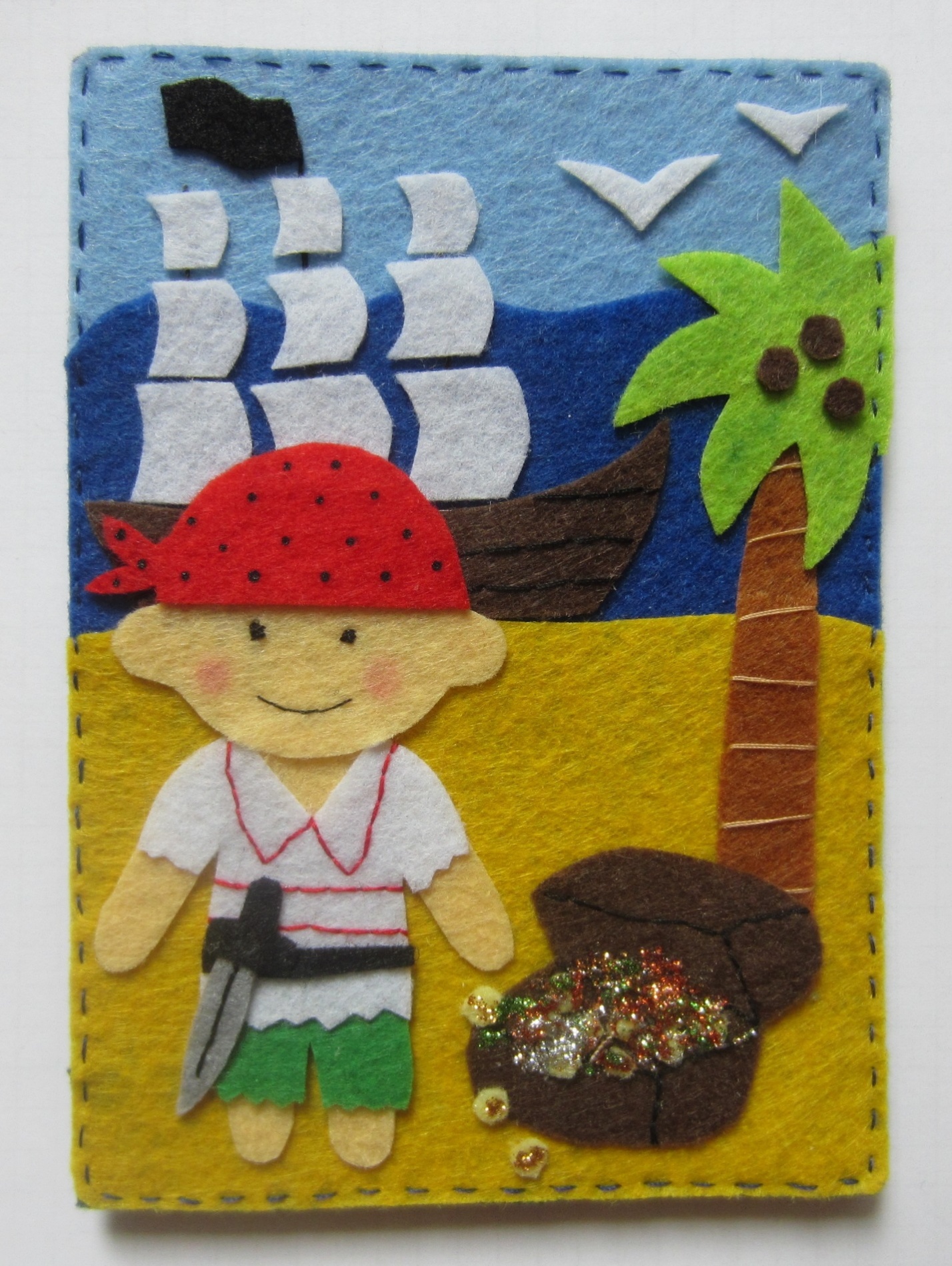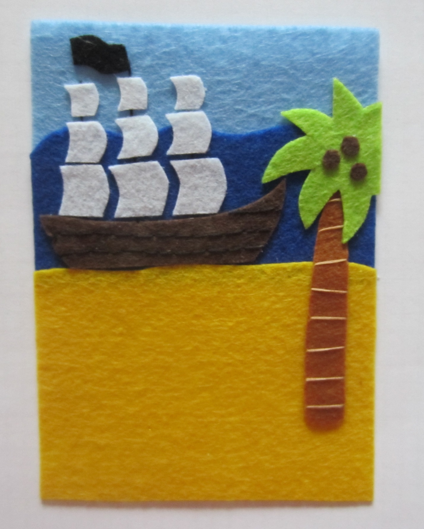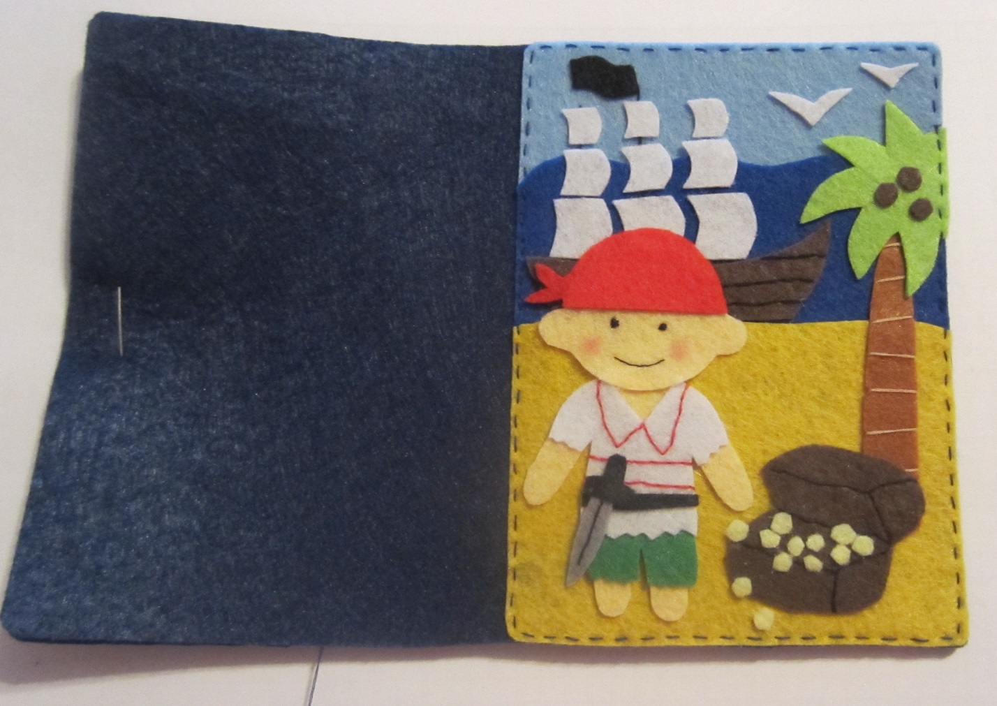 Теперь из цветного фетра вырезаем детали для аппликации. Для этого увеличьте или уменьшите следующие фотографии до нужного размера, подходящего для паспорта (небо 10×3 см, море 10×5 см, суша 10×7 см, голова пирата 5×3 см, длина корабля и ствола пальмы по 7 см), и переведите с монитора на бумагу (наложите лист бумаги на монитор и обведите ручкой или карандашом)или распечатайте. Вырежьте шаблон из бумаги, а затем переведите его на фетр.