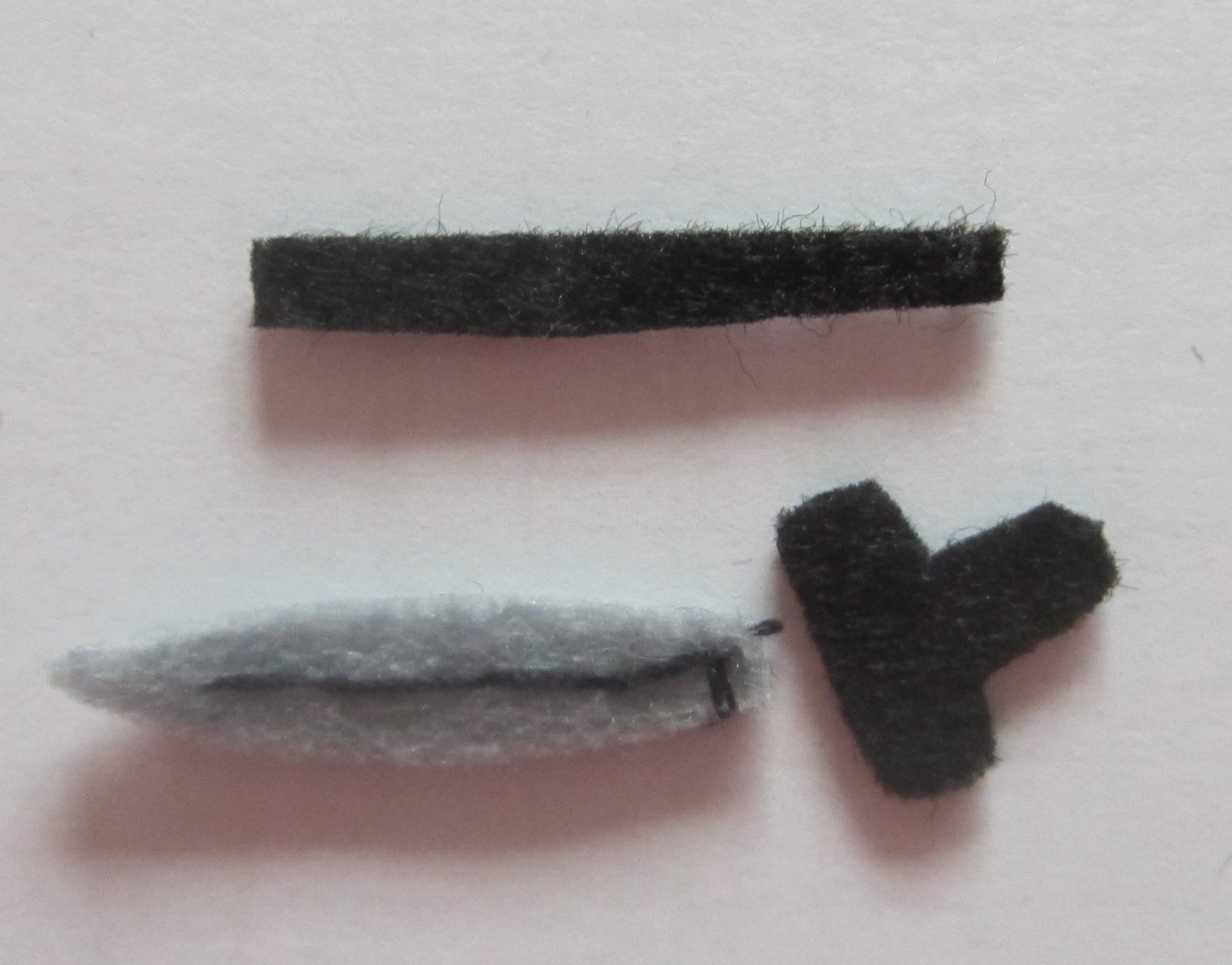 Из черного фетра делаем рукоять ножа и пояс пирата, из серого фетра вырезаем клинок, по центру лезвия и пояса делаем строчку.