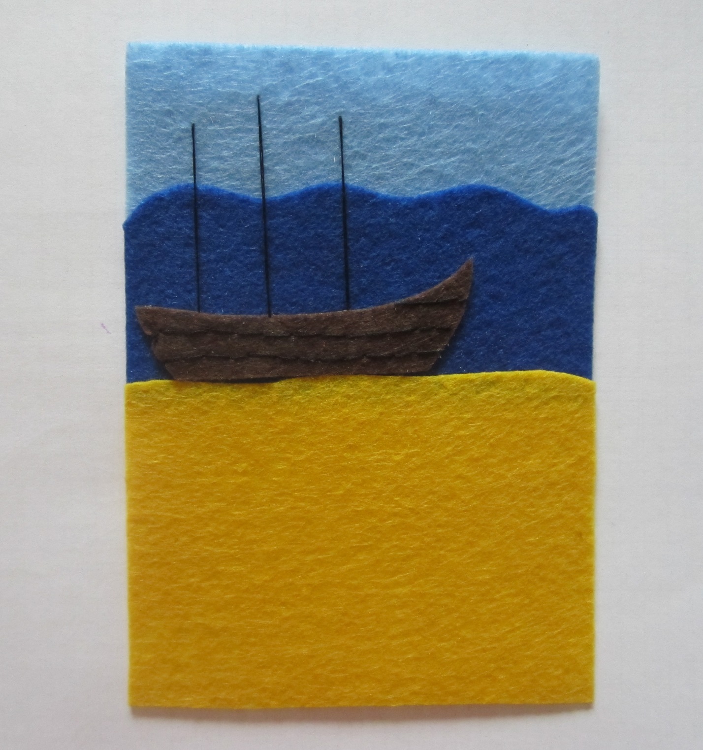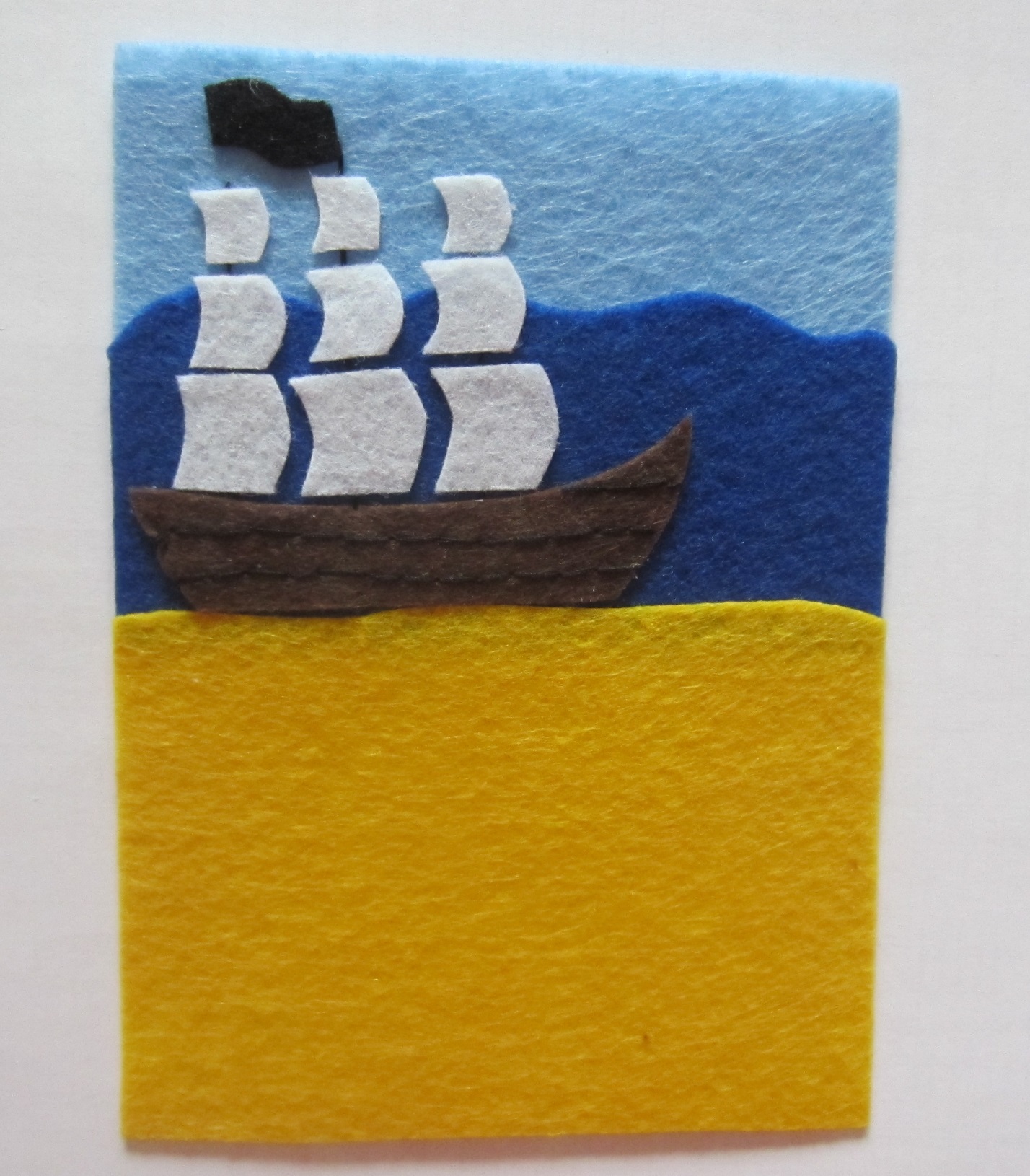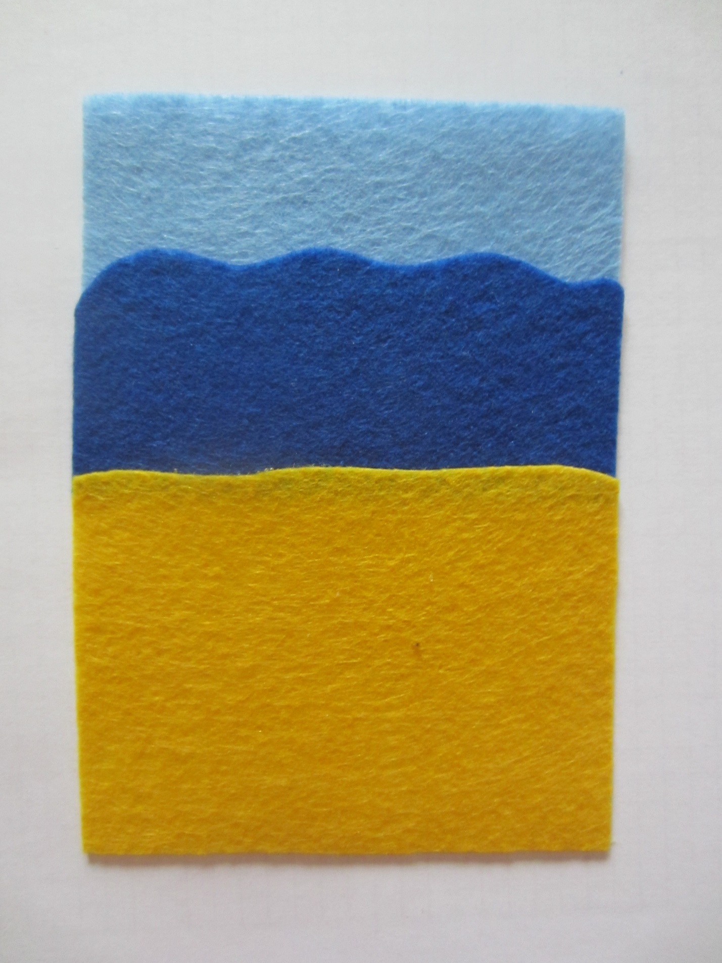 Вырезаем небо, море и сушу из кусочков цветного фетра, небо и море должны отличаться по цвету. В данном случае мы использовали для моря темно синий цвет, а для неба — светло голубой. Затем склеиваем отрезки ткани между собой так, чтобы получился прямоугольник 10×14 см.