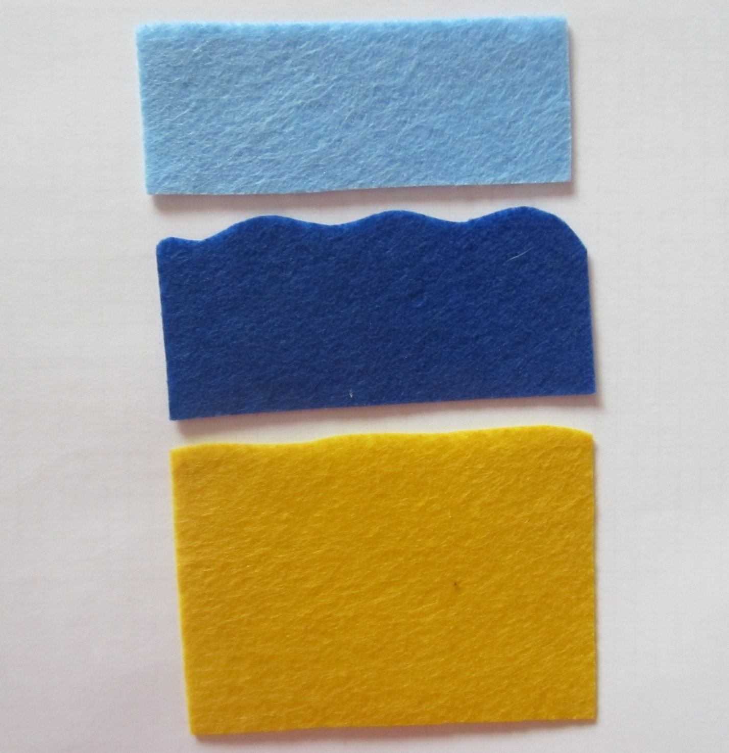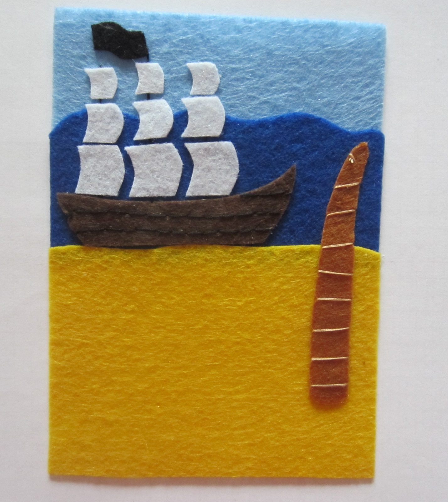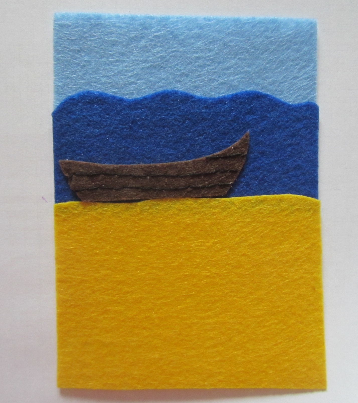 Вырезаем небо, море и сушу из кусочков цветного фетра, небо и море должны отличаться по цвету. В данном случае мы использовали для моря темно синий цвет, а для неба — светло голубой. Затем склеиваем отрезки ткани между собой так, чтобы получился прямоугольник 10×14 см.