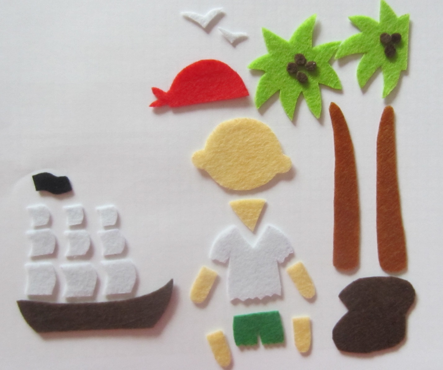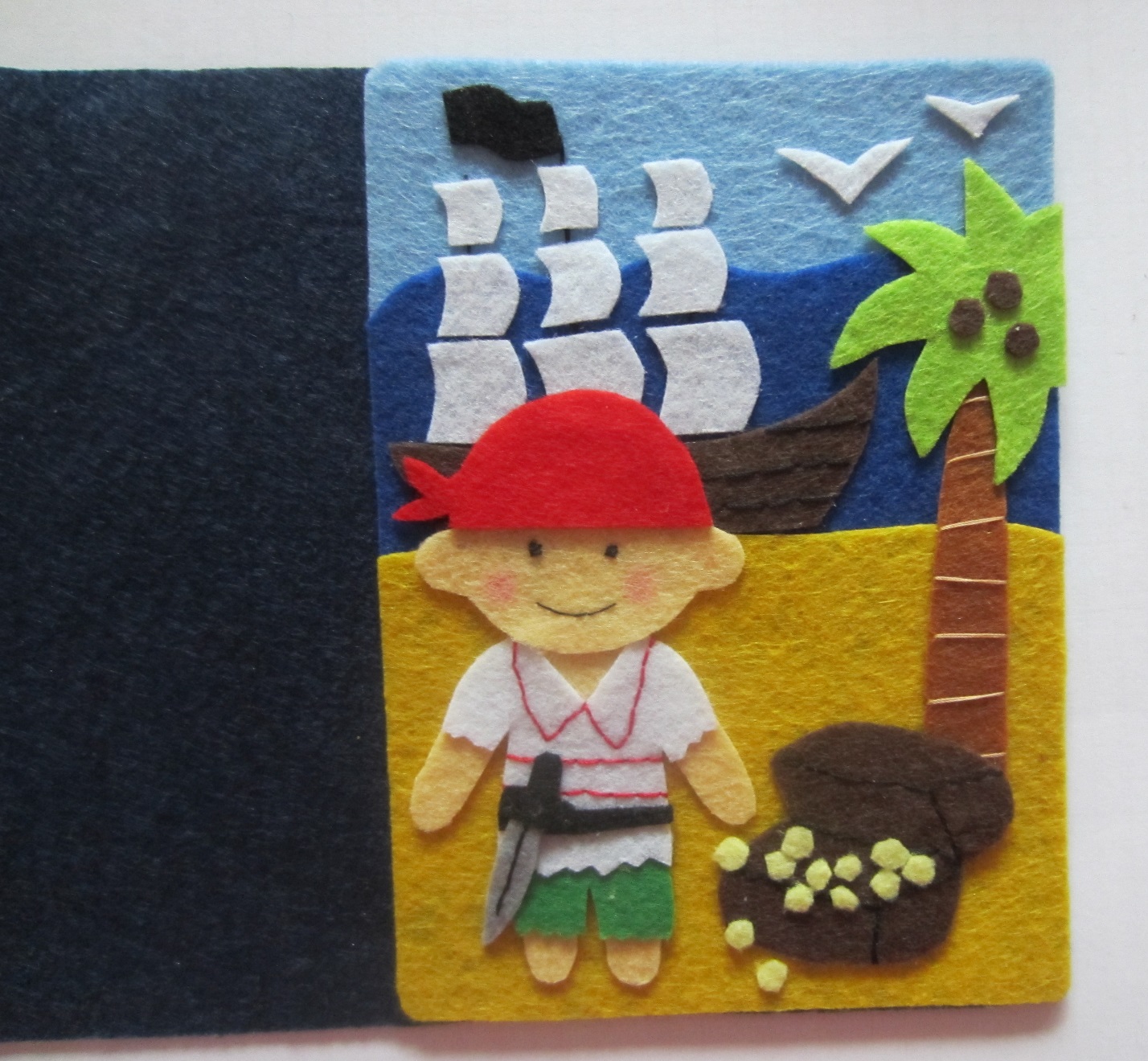 Слева приклеиваем фигуру пирата, в небе делаем чаек, внутрь сундука клеим кружочки из желтого фетра.