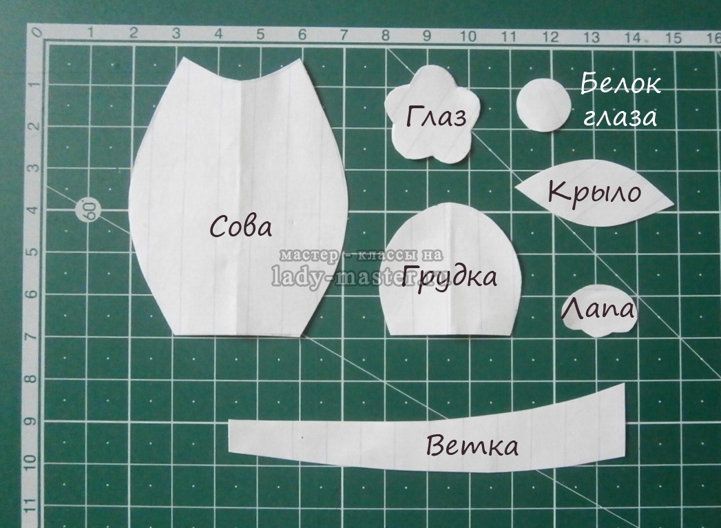 5. По подготовленному эскизу вырежем из бумаги детальки картинки – ветку, саму сову, грудку совы, крыло, клюв, глаз, белок глаза, лапу.