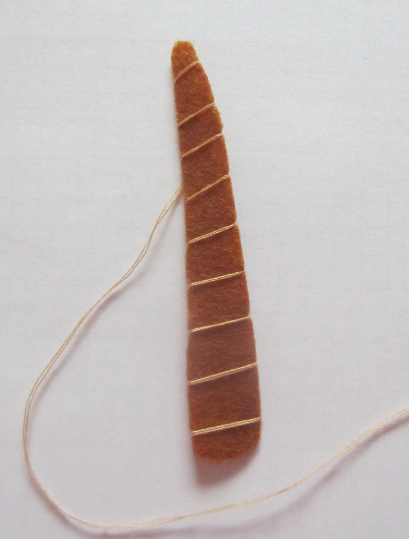 14. Возьмем детальки лап, вырезанные из светло-коричневого фетра, и пришьем их так, чтобы они частично находили на туловище совы и частично на ветку.