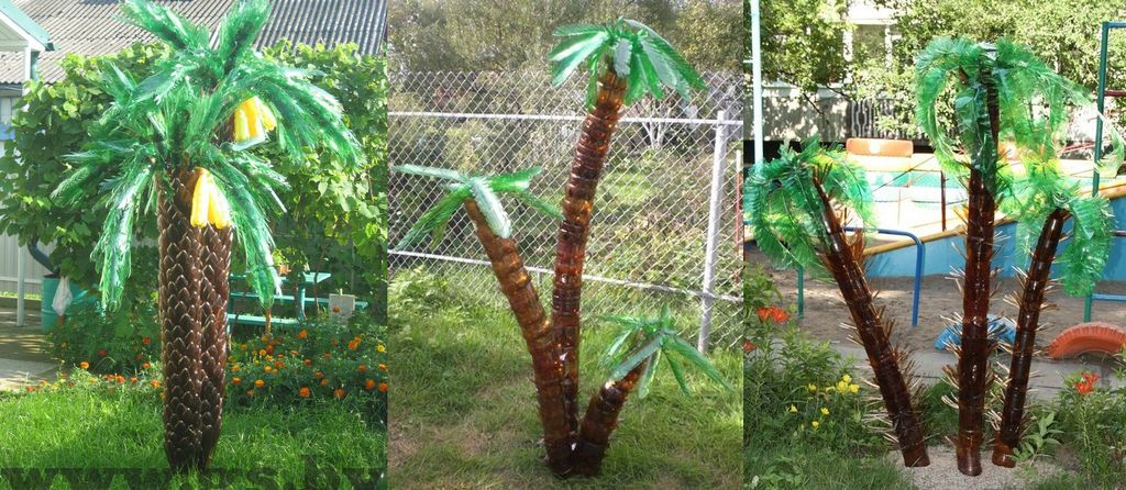 Но, можно использовать эти бутылки – из них часто делают разные украшения для участка. Нередко из ПЭТ-тары собирают пальмы. Такое украшение легко сделать – пошаговые инструкции с иллюстрациями каждого этапа процесса помогают собрать красивую поделку.