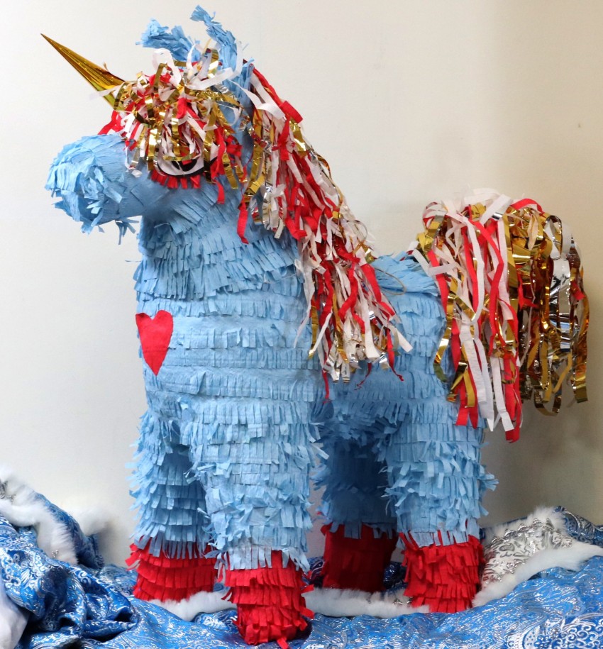 Ой, а вы не забыли заполнить свою лошадку вкусностями и приклеить ленты (возможно это нужно сделать на голову и туловище единорога), чтобы подвесить пиньяту?