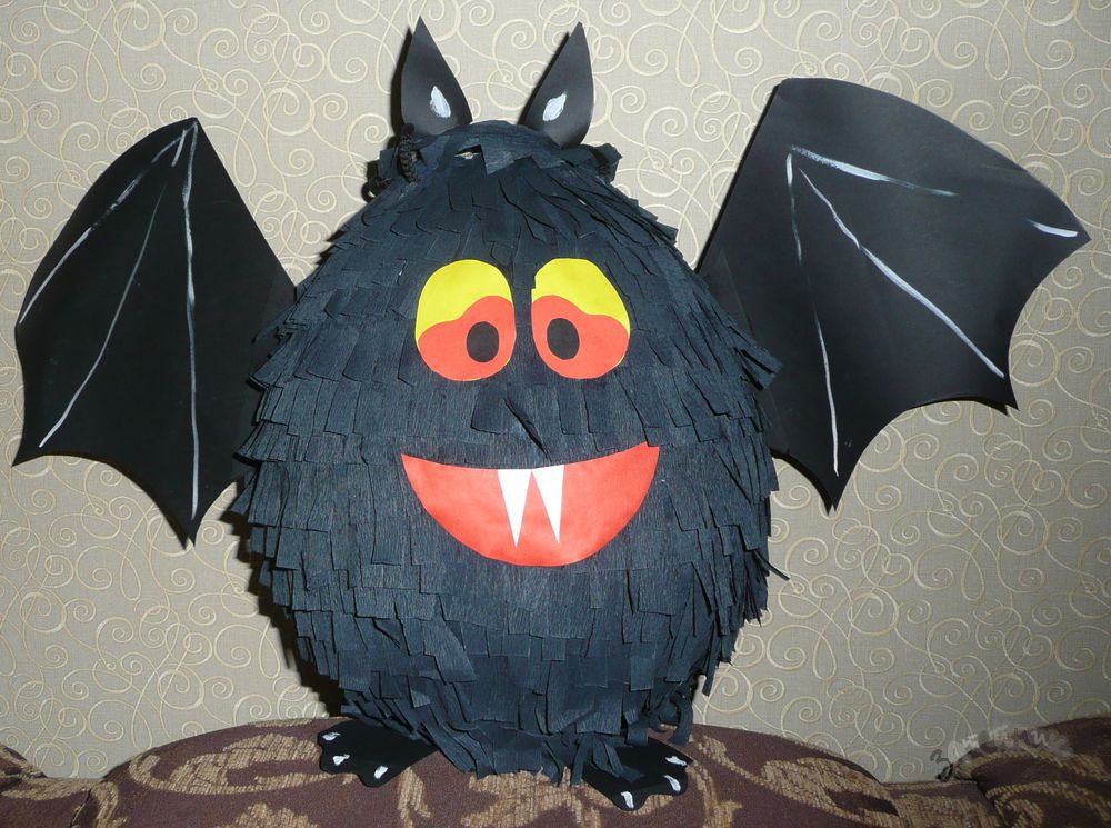 - Если мы на славу постарались, и сделали настоящего монстра-неубиенного – молодцы! Но придется делать еще одну игрушку, более «слабую», чтобы она таки разбилась. А первую пиньяту оставим, как трофей. Или же с первого раза не перестараться. Это касается и количества слоев, и то, как мы скрепили отдельные детали. Ведь скотч «разбить» точно не получится. А потому можно предварительно в некоторых местах сделать надрезы.