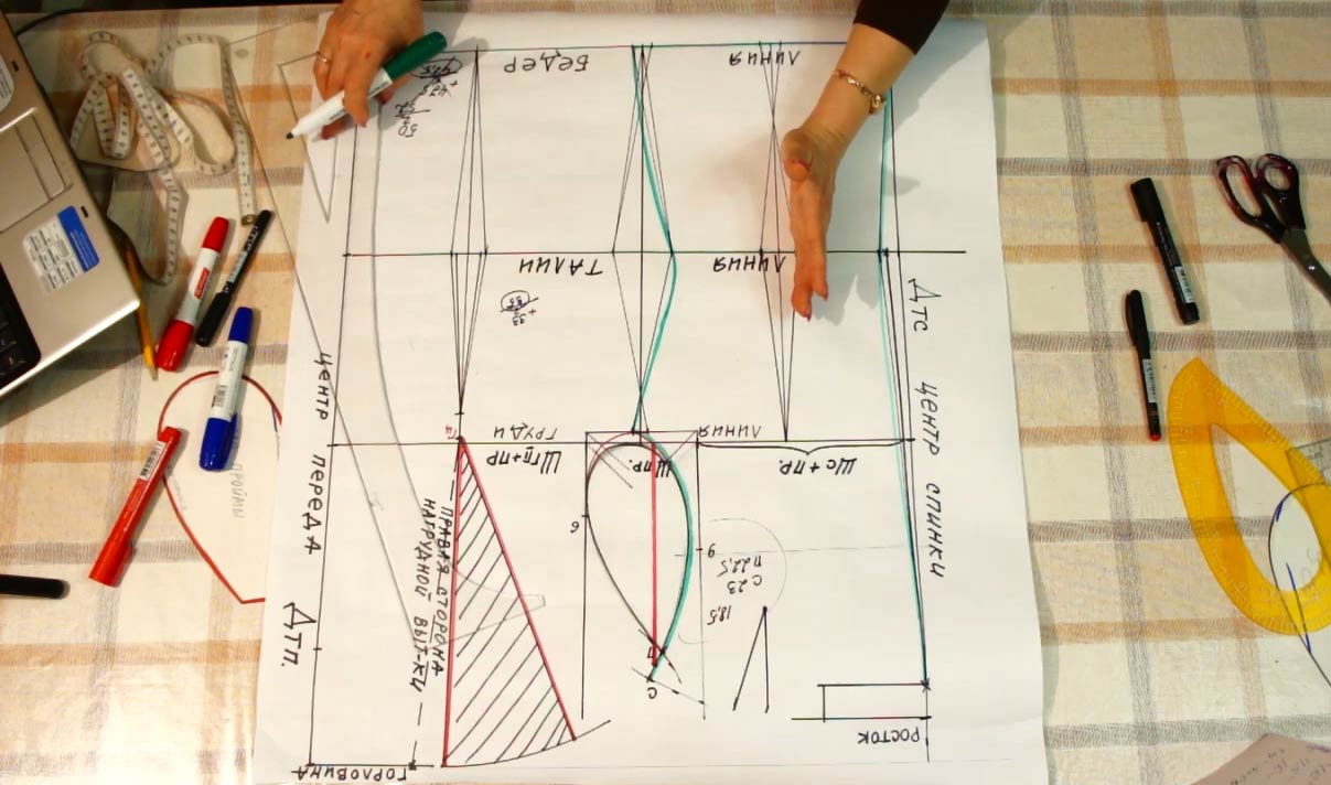 - На этой вертикали отмечают линию шеи, груди, талии и бедер.