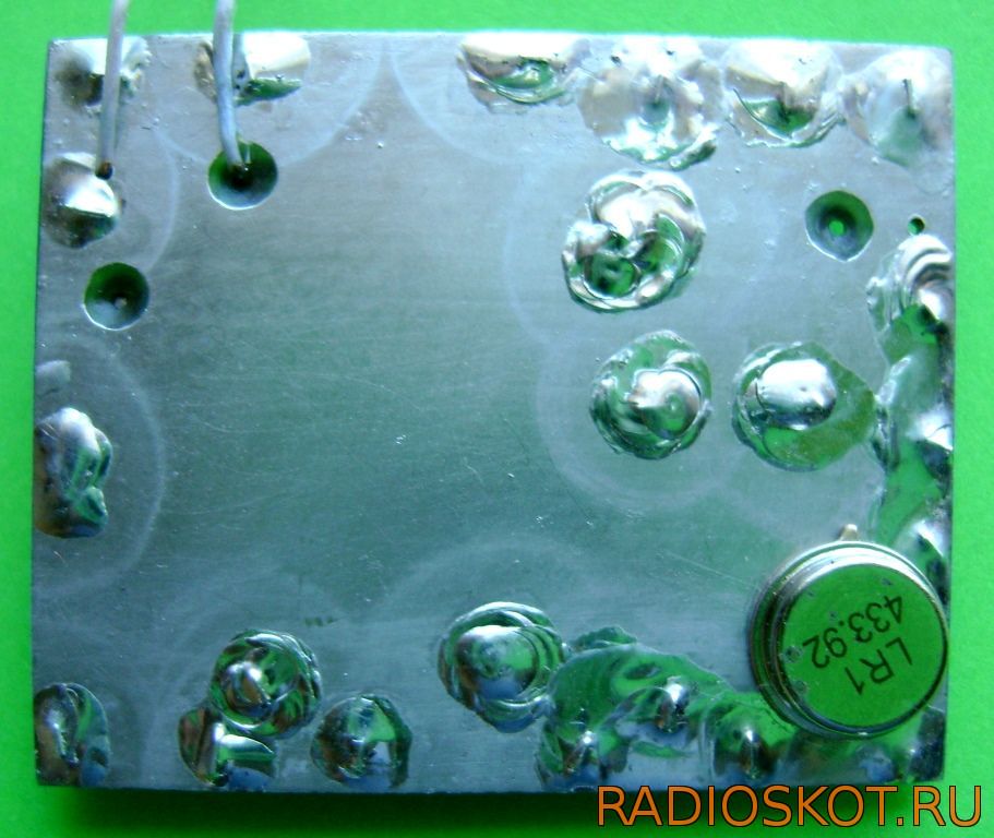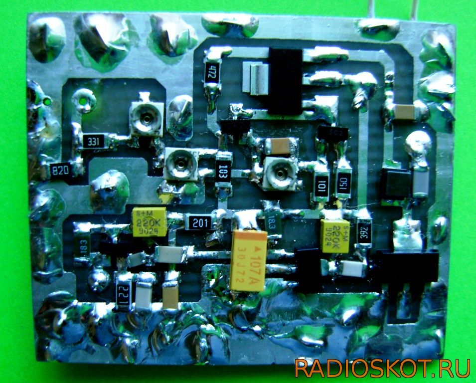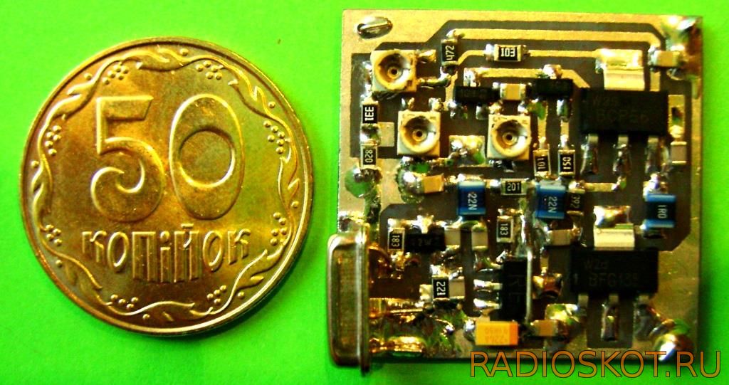 В качестве выходного транзистора для версии 1 Вт в этой схеме может работать хороший дешевый транзистор BFG35, который часто встречается в коротковолновых радиостанциях или кабельных усилителях ТВ. При мощности 1 Вт он будет только теплый, при том что радиатор — это просто кусок меди на плате 1 см2, к которой припаивается коллектор BFG35.
