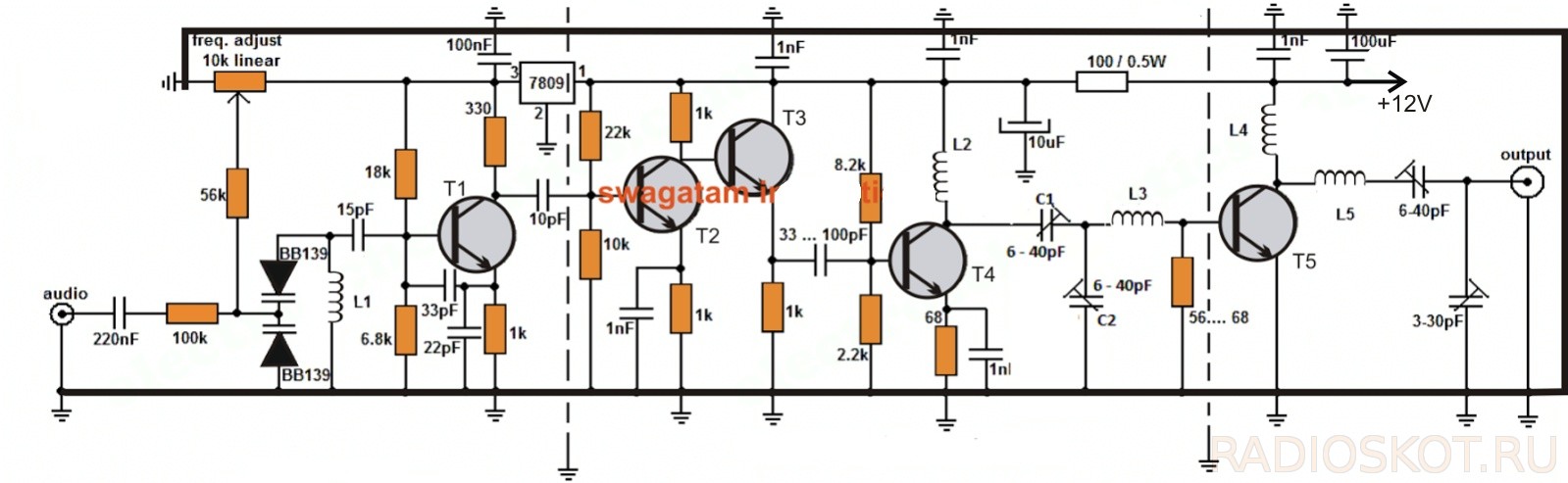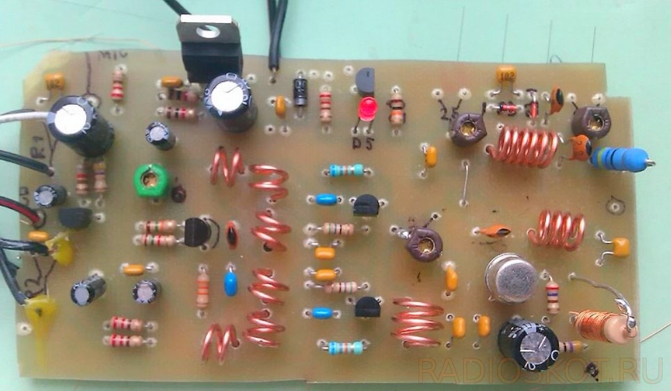Предлагаемый передатчик вещательного диапазона действительно очень устойчивый, имеет сложную, но качественную и продуманную схемотехнику, и использует стандартные FM-частоты 88 — 108 МГц. Его радиус действия составляет реальные 5 км. Схема включает в себя стабильный генератор питающийся через стабилизатор LM7809 — это 9 В стабилизированный источник питания, на транзисторе Т1 и элемент перестройки частоты потенциометр 10К. Мощность ВЧ выхода этого передатчика около 1 Вт. Пара варикапов MV2019 функционируют в качестве переменных конденсаторов.
