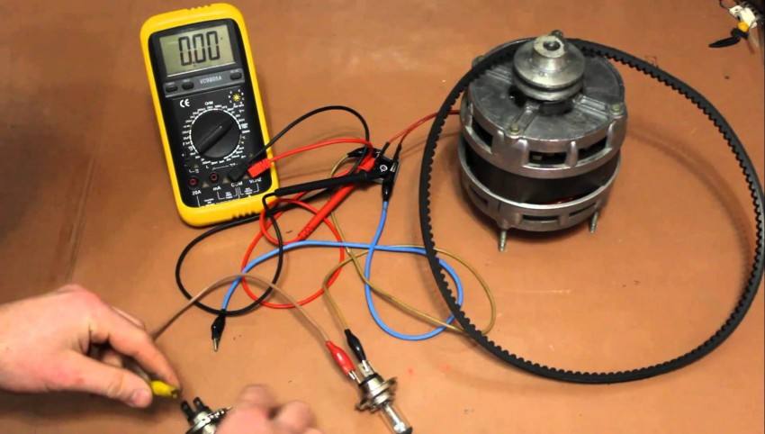 Простой контролькой (лампочкой с отрезком кабеля и вилкой на конце) проверяем работу нашего чудо-генератора.