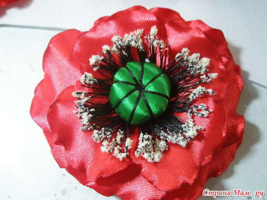 Прекрасным дополнением к макам станут ромашки, выполненные в технике «канзаши». Для их создания, необходимо нарезать белую атласную ленту шириной 1 см, на 9 отрезков равных 7 см в длину. Далее каждый из них следует сложить таким образом, чтобы образовался уголок. Нижние кончики этого уголка нужно сложить лицевыми сторонами друг к другу и аккуратно оплавить над огнем. После этого 5 лепестков необходимо собрать на нитку и сшить. Сверху приклеить слой из 4 сшитых лепестков. Серединку можно украсить приклеенной полубусиной желтого или оранжевого цвета.