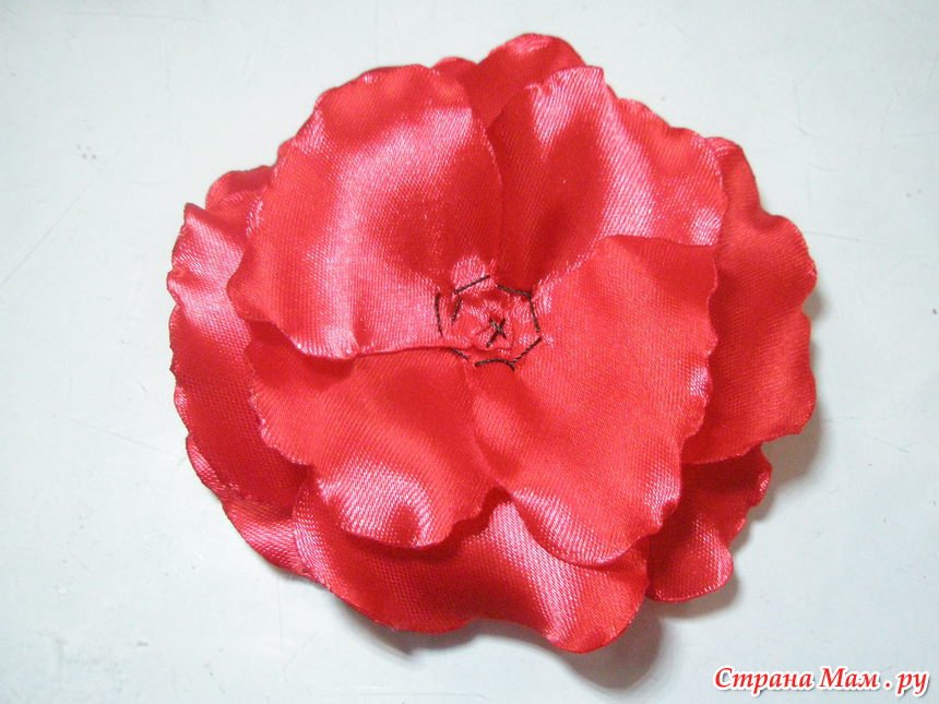 Для начала, нужно нарезать красную ленту на ровные квадраты и придать им форму капли (8 листочков делаем немного больше). На один цветок потребуется 12 квадратиков. Дальше, поднося края капельки к пламени свечи, аккуратно их растягиваем.