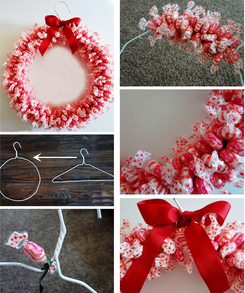 Мастер-класс по изготовлению оригинального венка-сувенира из обычной металлической вешалки и 1-2 кг конфет показано на фото ниже.