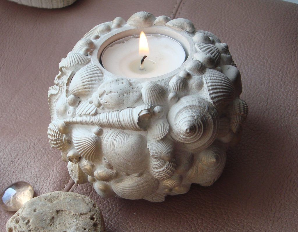 Популярны в качестве «ракушечного» декора и подсвечники для обычных и декоративных свечей. Здесь возможны два решения: либо оклеить нижнюю половину-треть непосредственно свечи, собирая симметричную конструкцию из разных ракушек, расширяющуюся книзу для придания свечке устойчивого положения,