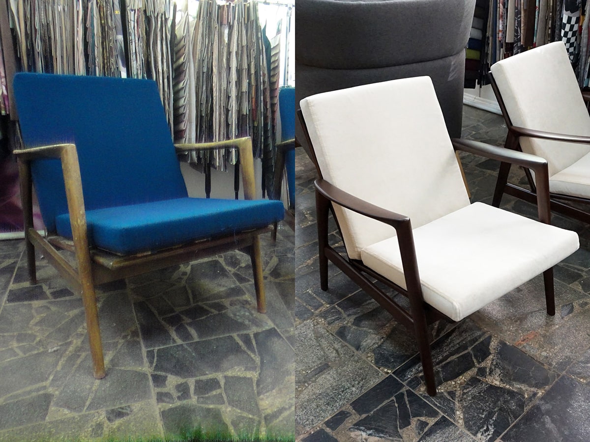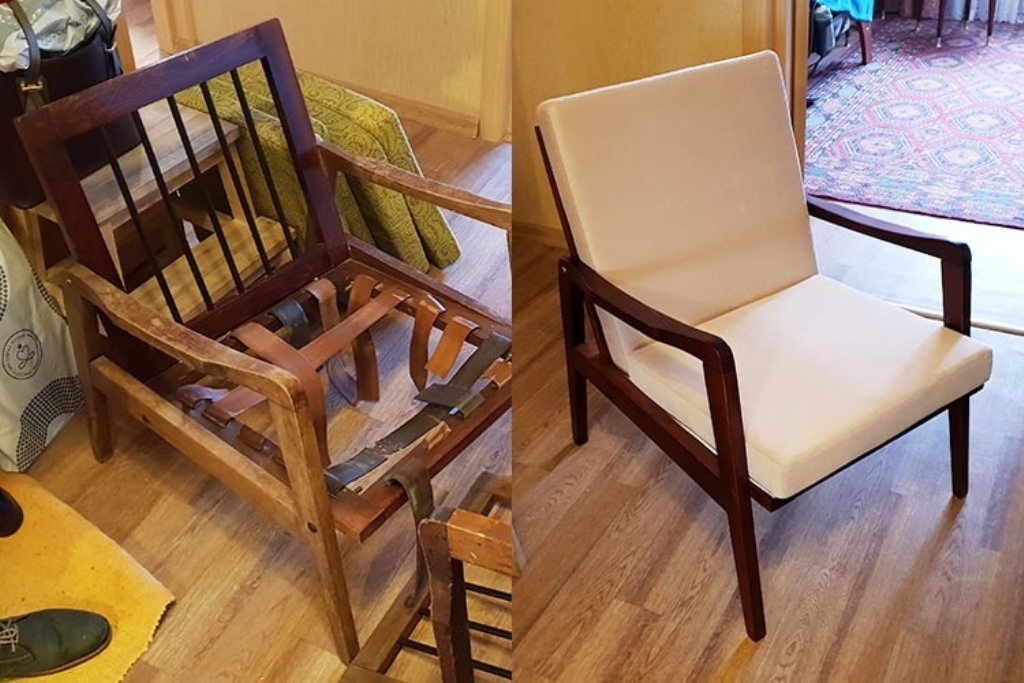 - Ремонт. Предполагается полное восстановление кресла, в частности, каркаса. Кроме того, при необходимости заменяют ножки, раздвижные механизмы, петли. В заключение меняют внутренний наполнитель и обивку.