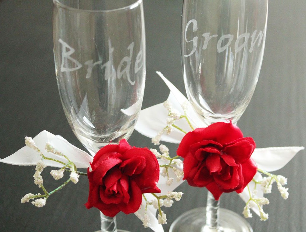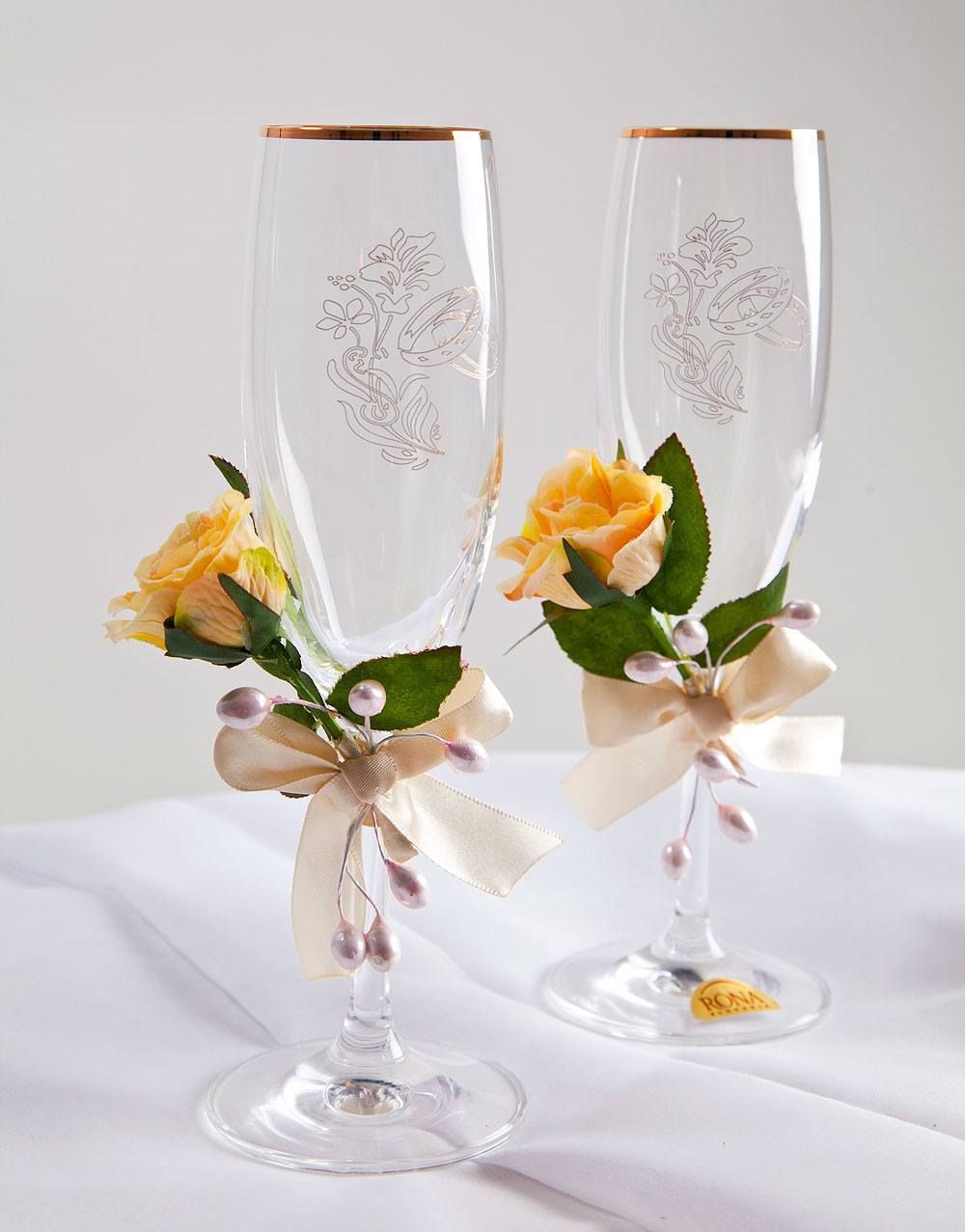Конечно, вы можете приобрести пару свадебных бокалов украшенных по последним тенденциям свадебной моды, но опять же, если вы хотите значительно сэкономить, лучше взять два обычных бокалов для шампанского, которые наверняка есть в вашем буфете и красиво их задекорировать своими руками.