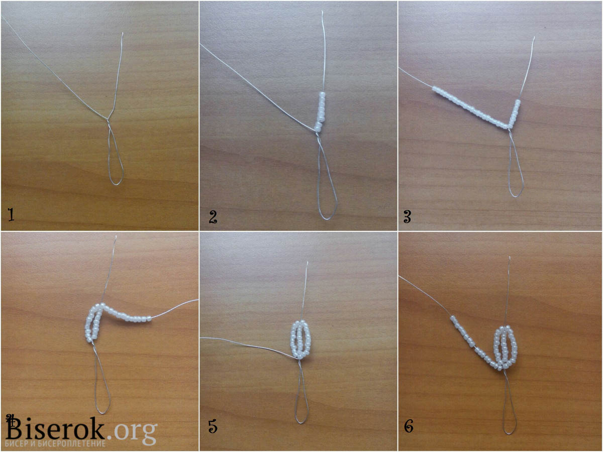 Затем пару бисеринок нанизываем на один из концов проволоки. Вторым концом проволоки продеваем их с противоположной стороны.