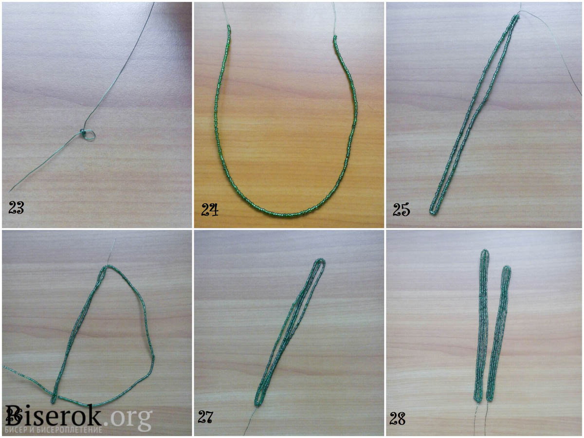 Теперь, снова набираем бисер, но на 1-2 см. больше предыдущего значения и делаем вокруг петли ещё одну петлю. (рис.26,27) Для того, чтобы лист не распадался, соединяем проволоки с бисером, сверху и снизу нашего листка, таким же образом, как соединяли середину цветка. Таких листьев нужно всего 2. (рис.27,28)