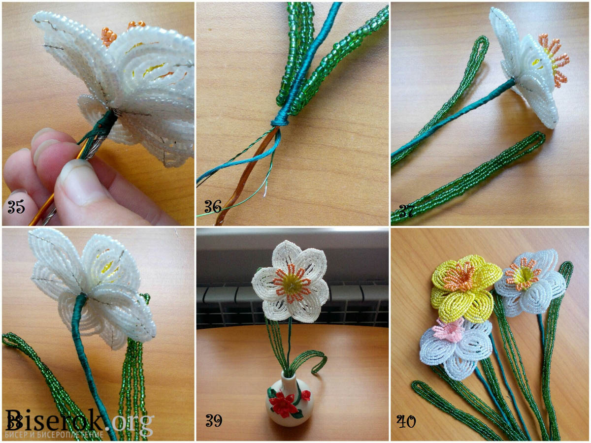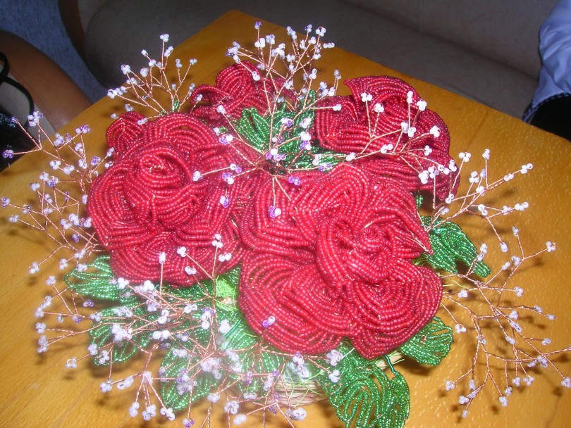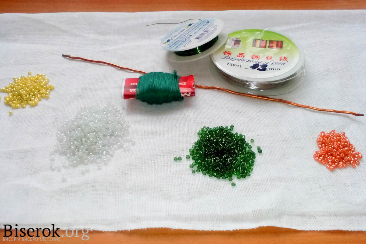 Бисер — довольно тяжелый материал, и некоторые сложные или крупные изделия, выполненные из него, получаются довольно увесистыми. Поэтому иногда для укрепления стеблей цветов используют специальную флористическую проволоку диаметром 0,6-1,2 мм — она продается в цветочных магазинах в виде связок из отрезков длиной 0,25-0,40 м. Имея небольшой диаметр, такая проволока достаточно упруга, чтобы придать цветку нужную форму.