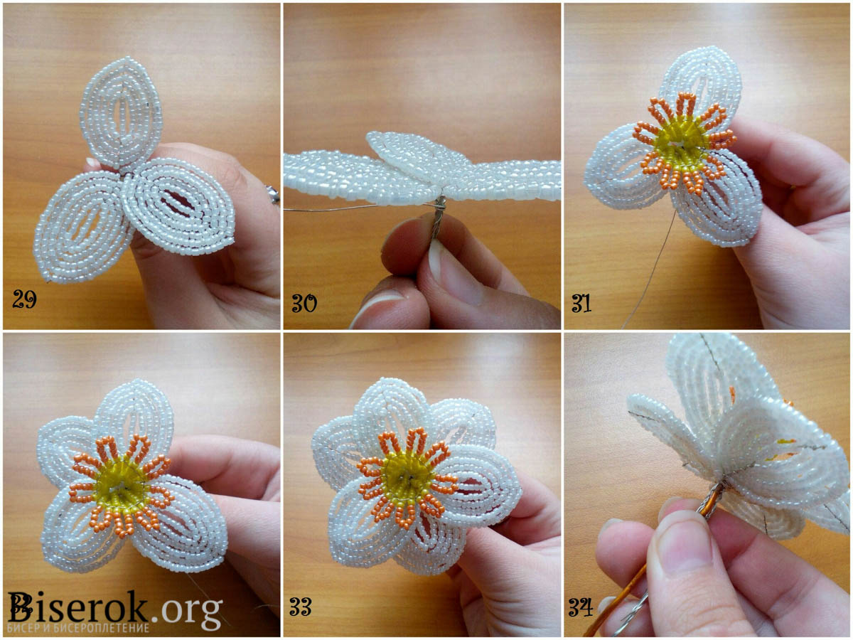 И вот наконец, мы приступаем к сбору нашего цветка. Для начала берём 3 белых лепестка и соединяем их проволокой. (рис.29,30) Между ними добавляем серединку(рис.31) и по одному добавляем между лепестками, другие лепестки (рис.32,33)