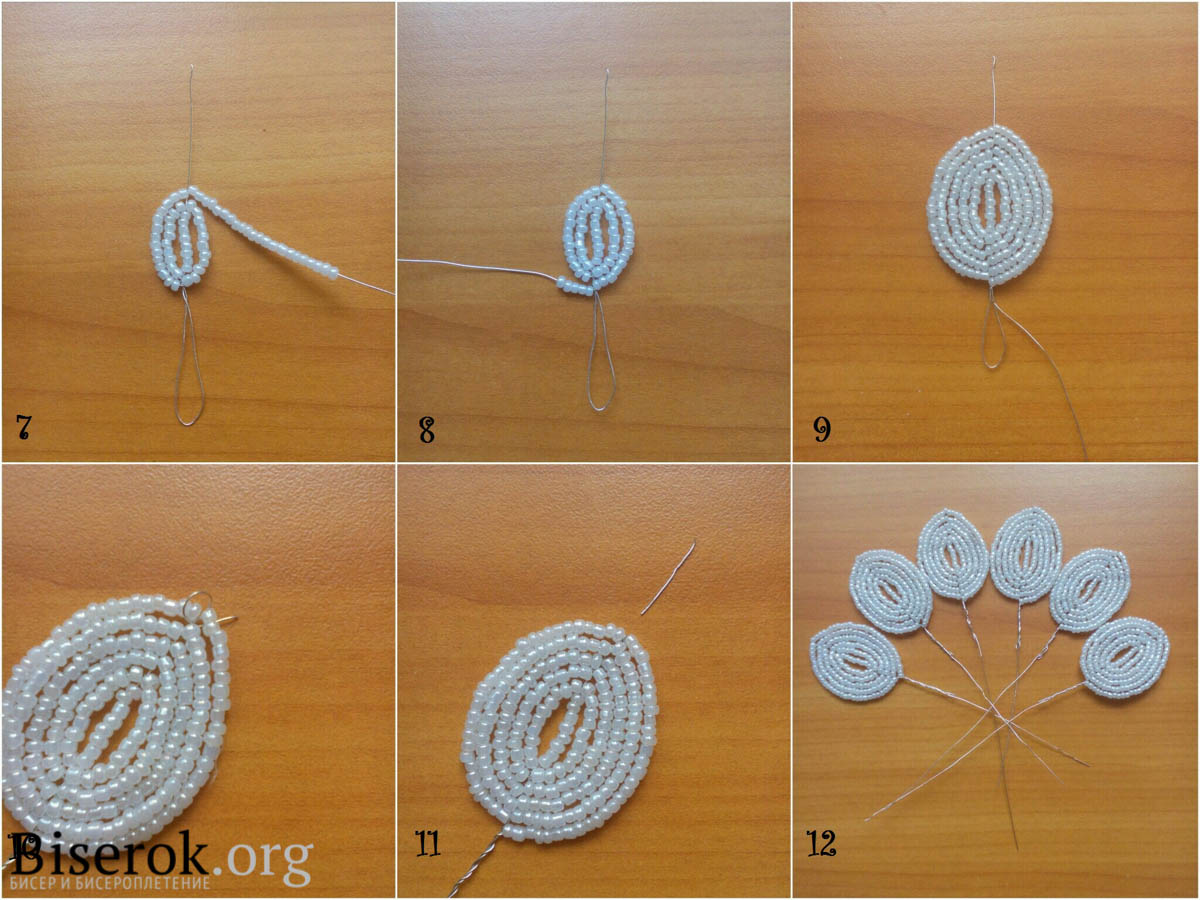 По аналогичной схеме необходимо наплести 4 ряда, в которых будет по 3, 4, 4 и 2 бусины, а после завязать из узелком и сделать таким образом аж 6 компонентов. Таким образом мы сплетем листик.