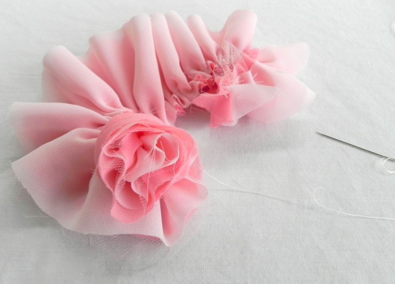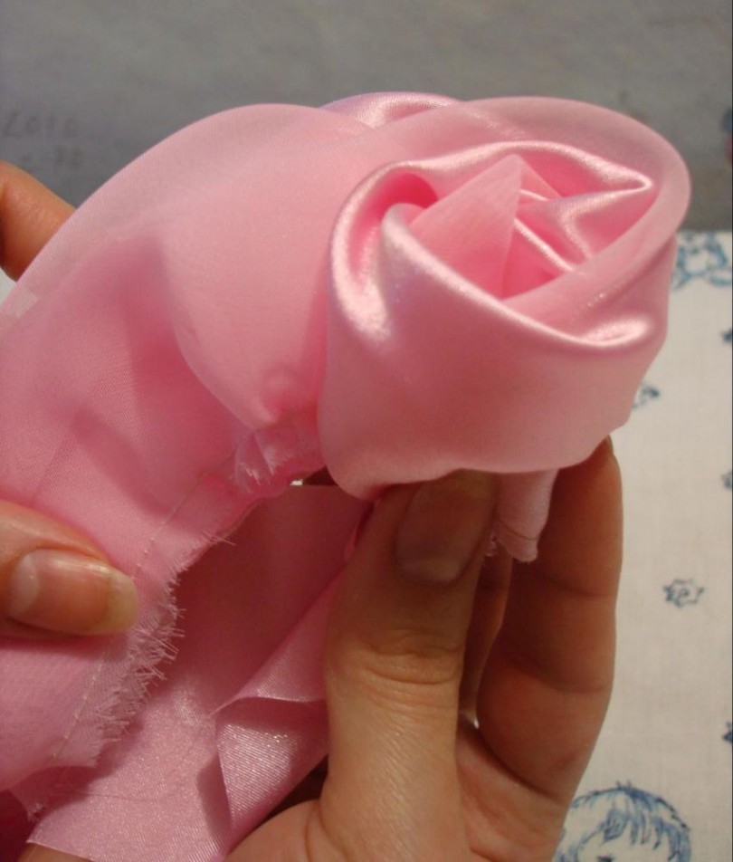 Пройдясь иголкой по необработанному краю, можно переходить к следующему этапу. Если дома есть швейная машинка, с ее помощью процесс значительно ускорится, на красоту розы из материала такие действия не повлияют.