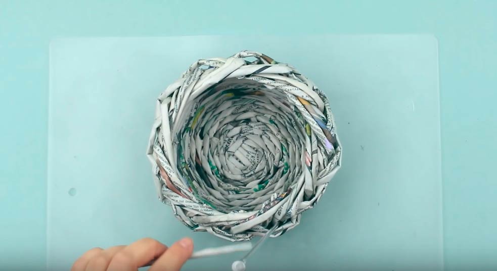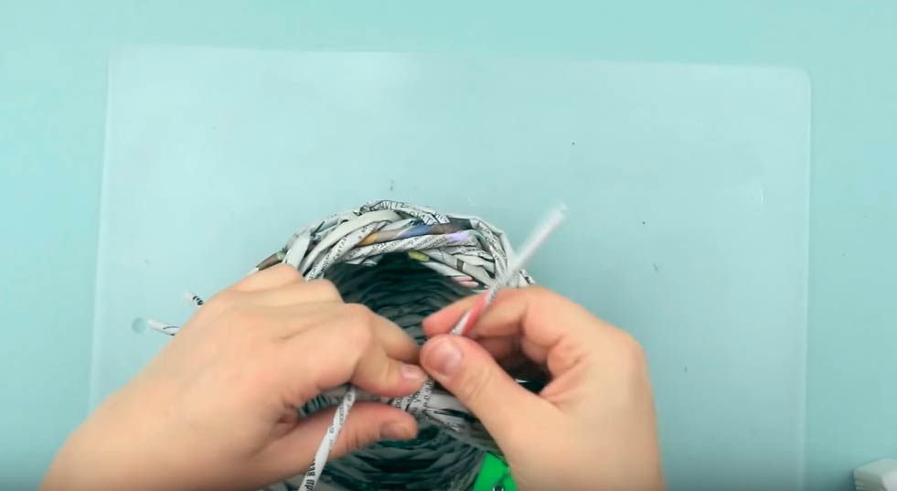 Когда вам захочется закончить плетение, то главные прутья просто можно обрезать и склеить один в другой, а затем спрятать, приклеив вниз.