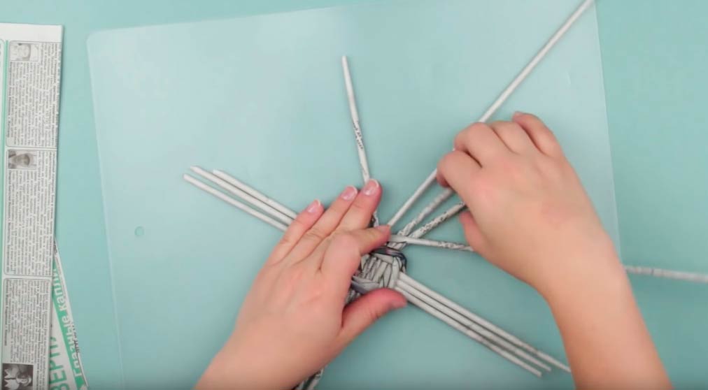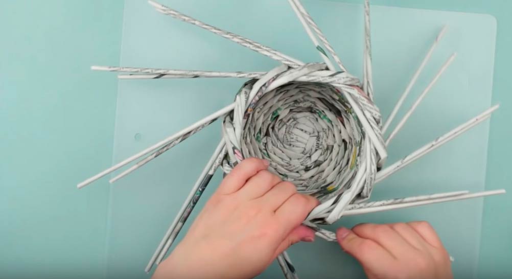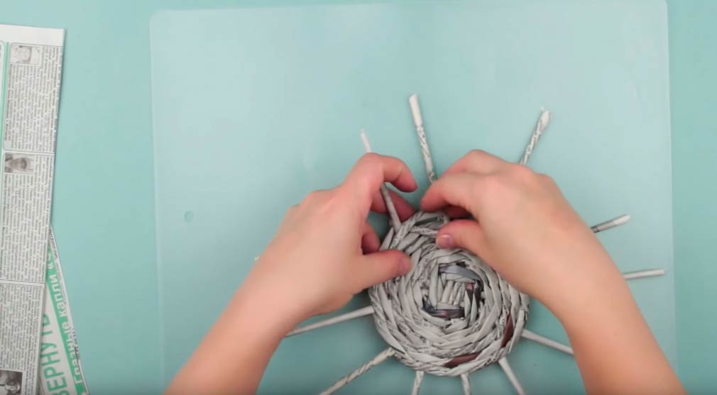 Продолжить в такой последовательности плетение дна корзинки, пока не появятся 2 ряда. Это необходимо делать по кругу, двигаясь по часовой стрелке. Ряды рекомендуется укладывать плотнее, чтобы не было щелей в дне корзинки. При необходимости наращивать ведущие трубочки, как делалось изначально.