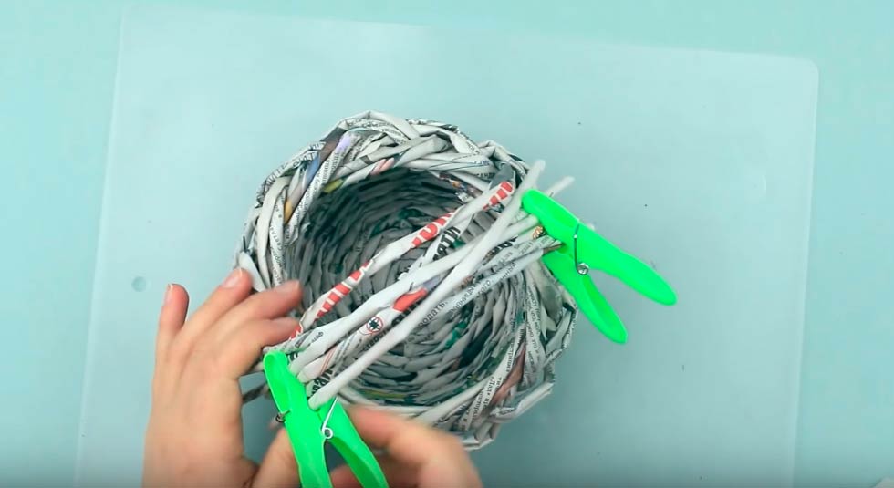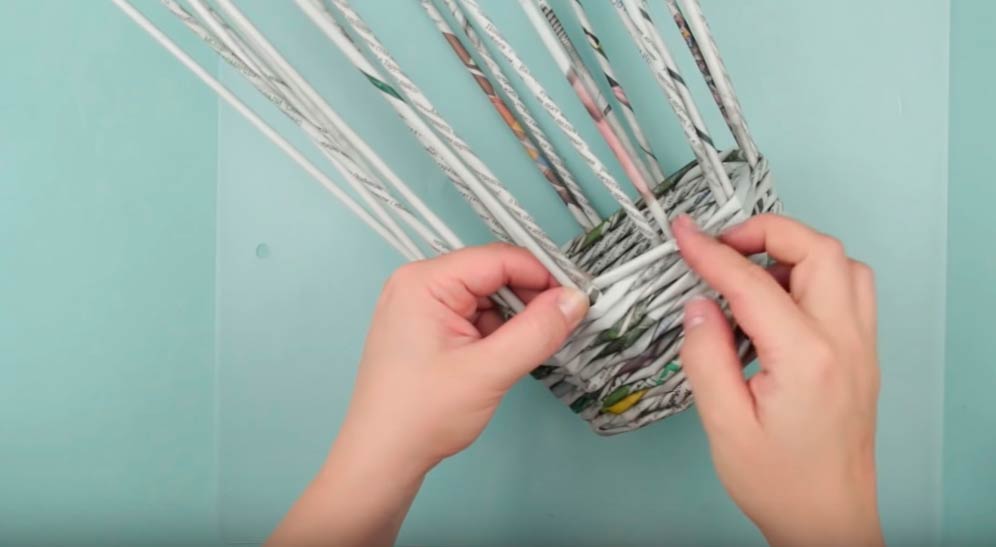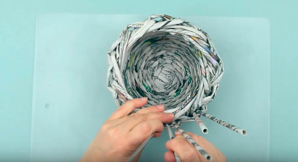 Сделать каркас для стенок корзинки. Завести последнюю трубочку под дно трубочки, следующей за ней. Вывести ее наверх. Новую нижнюю трубочку завести под следующую, после чего выпрямить. Сплести ряд до конца. Последнюю стойку ряда завести под самую первую. Выровнять вверх все трубочки.