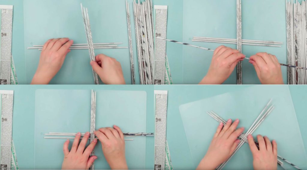 В первую очередь необходимо сделать трубочки из газет. Для этого необходимо сложить бумагу 8 раз и срезать линии сгиба. Взять одну полоску и нанести тонкий слой клея по краю. С помощью спицы плотно скрутить газетный лист. Это необходимо делать, начиная с угла. После этого аккуратно снять трубочку со спицы. Всего понадобится около 20 заготовок.