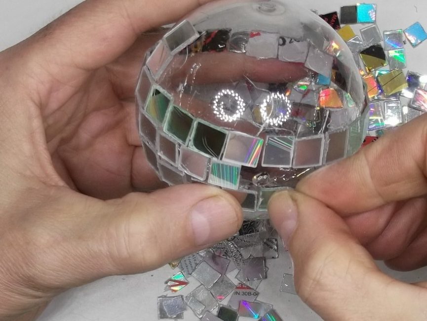 Берем прозрачный елочный шар, наносим каплю клея, приклеиваем на это место кусочек диска переливающейся стороной наружу. Таким образом создаем мозаику из переливающихся кусочков, оставляя между ними небольшие просветы.