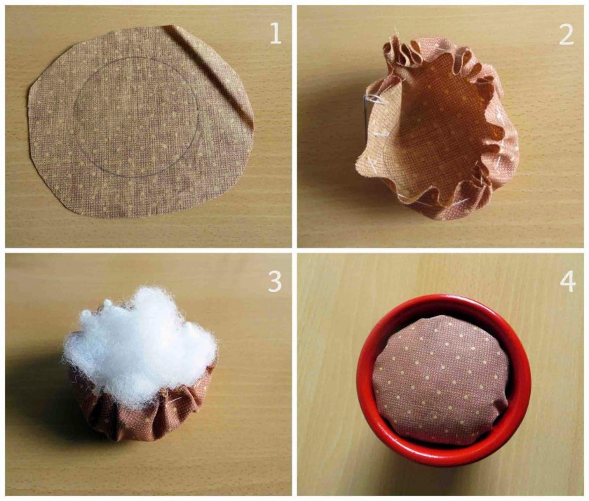 Чтобы изделие было устойчивым, из плотного картона вырезают круглую деталь. Берут ткань, немного стягивают по краю, внутрь помещают синтепон. Сверху должен находиться картонный круг.