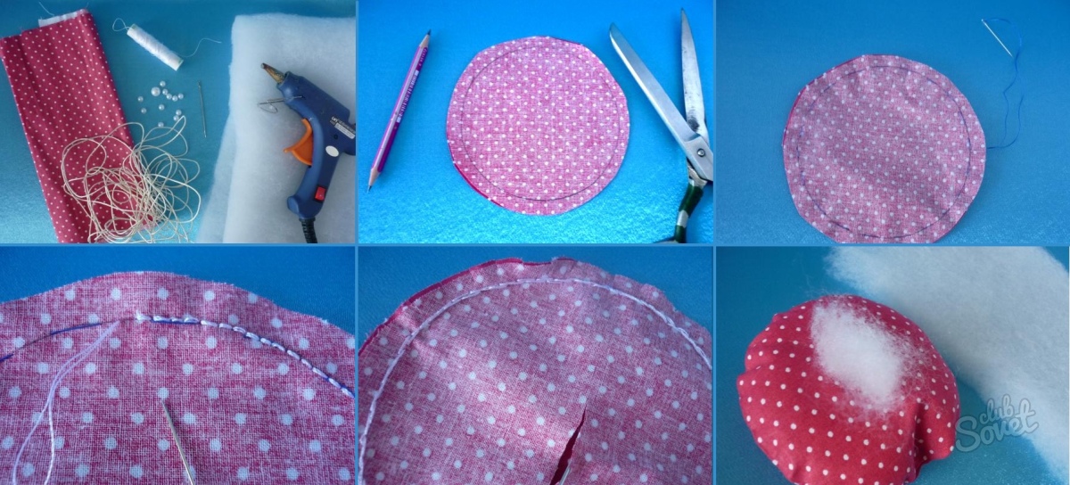 Набиваем плотненько его синтепухом, одновременно подтягивая нитку, чтобы наполнитель не вывалился, а расположился внутри (см. рис. 4, 5 и 6). Тоже самое проделываем и с остальными кружочками.