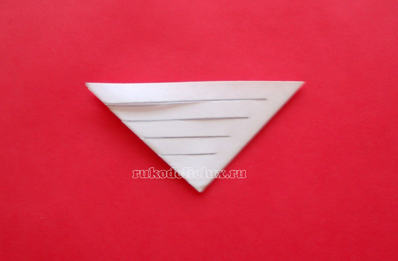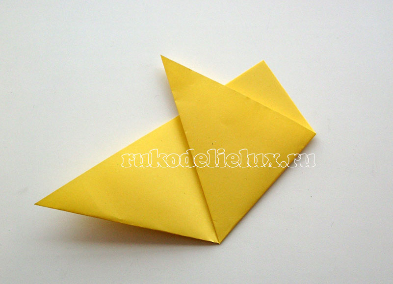 Далее начинаем отгибать треугольники на лицевую сторону. Углы треугольников должны соединиться.