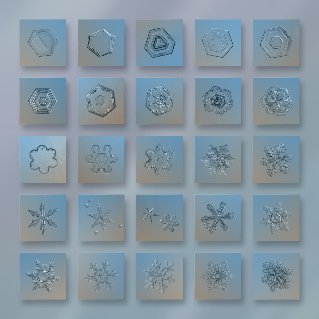 Кристаллы-столбики, образующиеся в холодных облаках высоко над землей при очень низких температурах, падают на грунт сквозь более теплые облака, при этом на концах могут вырасти звездочки. Так же как историю путешествия градины можно выяснить по ее кольцам, так форма снежинки — это естественная запись ее маршрута по разным облакам с различной температурой. Каждая снежинка неповторима, со своей великолепной конструкцией, единственная во всем мире. Посмотрите на снежинку, и вы увидите сложную фигуру, где внутри одной звездочки находятся другие кристаллы.