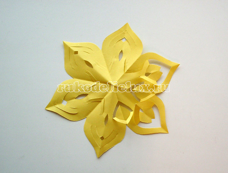 Ее сделать будет значительно сложнее, чем предыдущую. Поэтому желательно использовать не совсем тонкую бумагу, иначе снежинка порвется в тонких местах (так как порвалась у нас на нижнем фото), но и не совсем толстую, иначе вам будет сложно разрезать такой объем в плотных изгибах. Лучше всего подойдет для этих целей неплотная бумага формата А4.