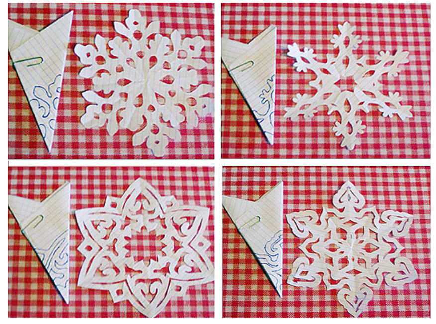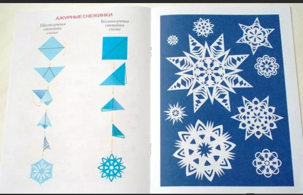 Забавно выглядят снежинки, вырезанные из журналов и старых газет. Интересны поделки из кальки. Это тонкий, но достаточно прочный материал, который позволяет изготовить удивительные воздушные снежинки.