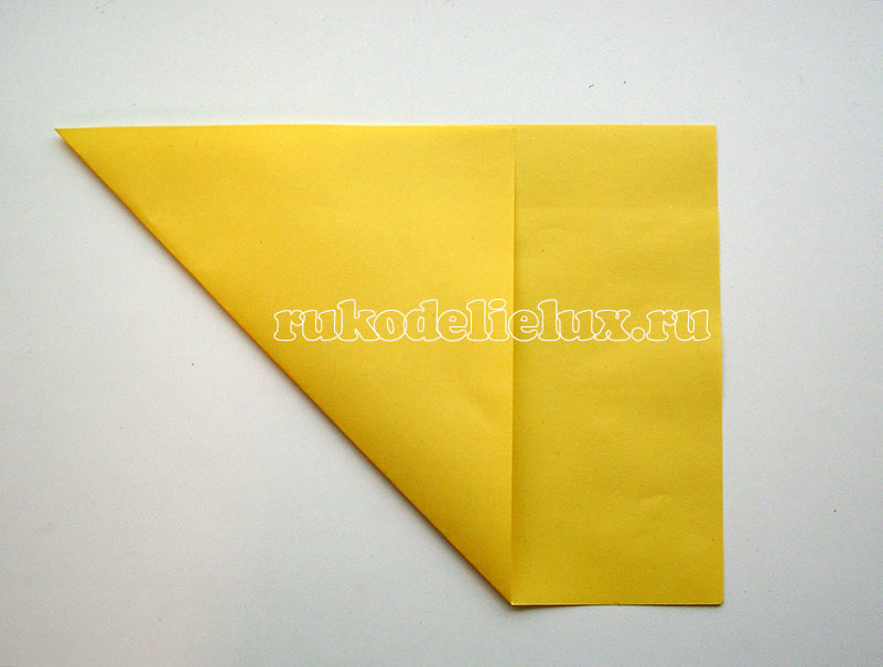 - Сделайте из листа А4 квадрат, как показано на 1 картинке. Сложите его в два раза.