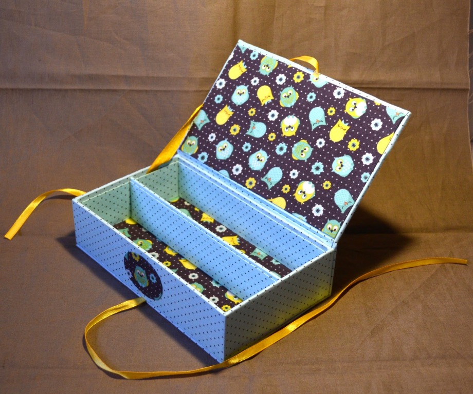 При желании можно удалить подвернутый край со всех сторон, оставляя при этом идеально ровные края. Готовую шкатулку декорируют тканью, под которую подкладывается тонкий слой поролона. Роскошно выглядит шкатулка украшенная бархатом или флизелином.